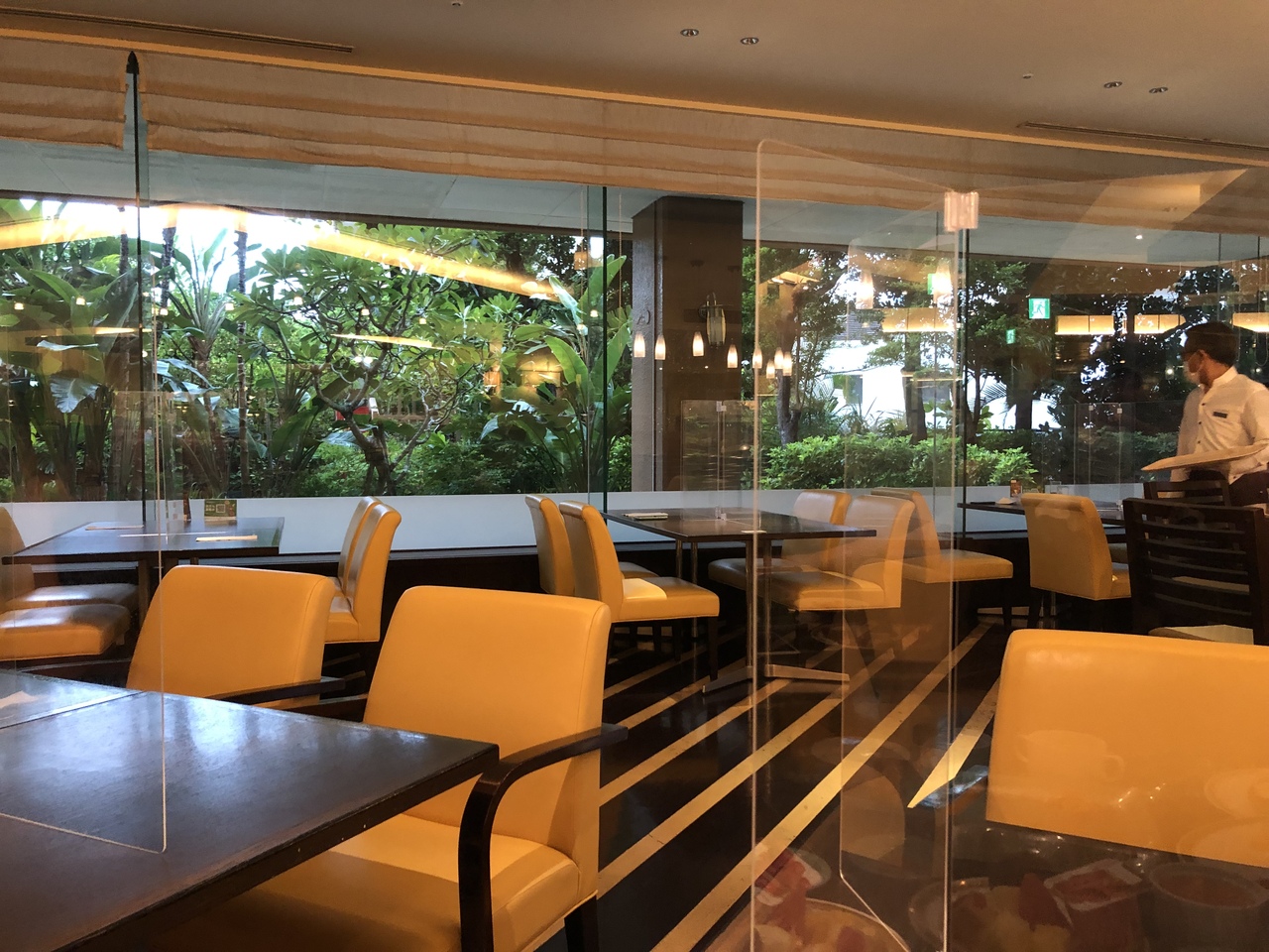 那覇・泉崎の沖縄ハーバービューホテルの地下にあるレストラン。ハーバービューホテルは坂の上にあるので、地下とは言え、窓からは木々に覆われた庭園の中にあるようなレストランで、窓側の席は気持ちがよいです。