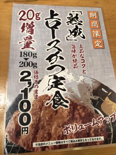 今回は「熟成上ロースかつ定食」か「とろ旨ロースかつ定食」で迷いましたが、ちょうど通常180gを200gに増量サービス中ということで、上ロースに。熟成とんかつは、豚肉を低温で18日間熟成させることで、酸素の働きによって保水性が高め、旨味と柔らかさを最大限に引き出したもの。確かに柔らかさが引き立ち、ジューシーさがあります。また、ひきたての生パン粉を使用しており、サクサクとした食感で、脂っこくなく美味。
