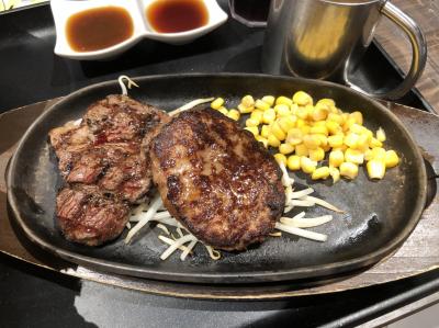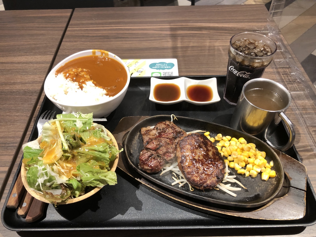 今回は、ステーキとハンバーグ両方が楽しめる「溶岩焼熟成アメリカンステーキ&ハンバーグコンボ」を注文。まず牛肉は少し固めではあるが、しっかりとした赤身肉で、価格を考えるとかなり良い線をいっている。ハンバーグは逆にかなり柔らかい。残念なのは、せっかく鉄板を使っているものの、ガスが使えない(フードコートなので)ためか、すぐに冷めてしまうことと。もう一つ、3種類のうちから2つ選ぶソースにもう少しこだわりがあるとよいかと。カレーはお肉屋さんのカレーで満足感あり、サラダはドレッシングが美味でした。総合的にはお財布に優しいステーキ店だと思う。- 旅行時期