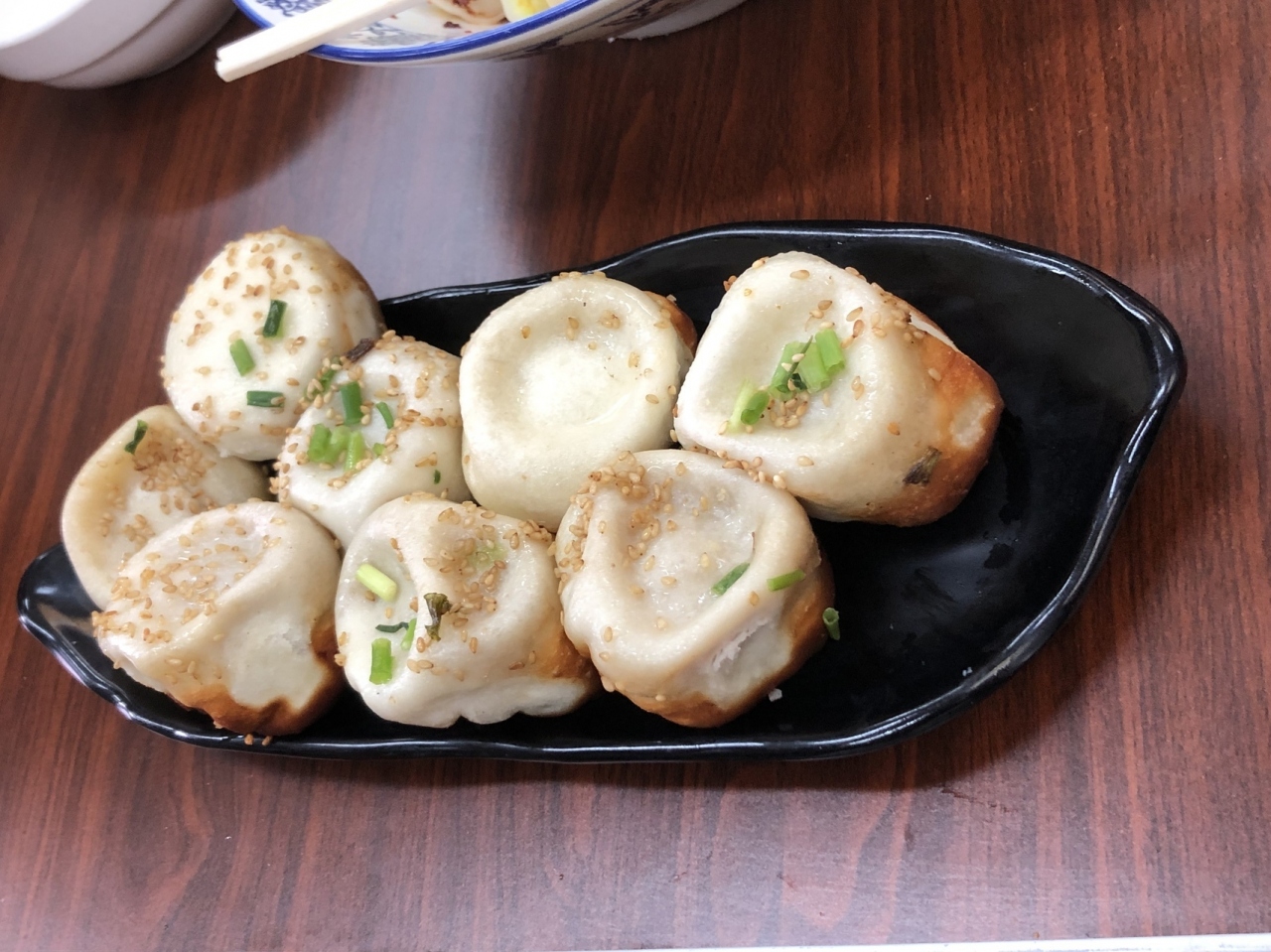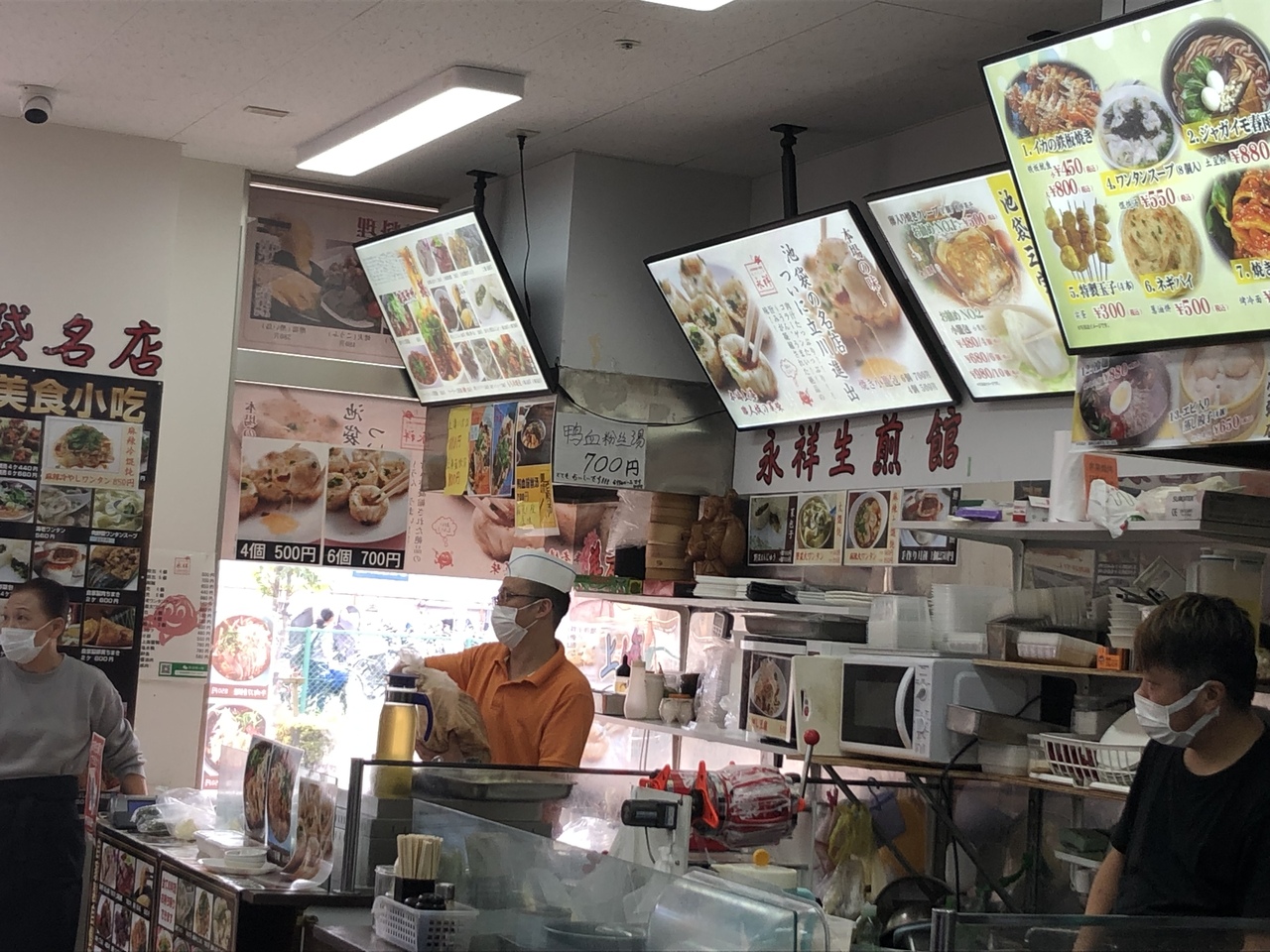 お店に入ると、突然、中国の匂い(一説には八角では?)がする。飛行機から中国の空港に降りて空港内を歩きはじめた時と同じ匂い。普段の日本では感じることのない匂い。フードコートは、中国食材の並ぶコーナーの左横に申し訳ないような入口があります。お店は5軒入っており、焼き小籠包、お粥と麺、粉物、さらには台湾料理のお店があります。お店の雰囲気、テーブルをはじめ、日本っぽいところはなく、まさに飾らない中国のお店(一応、清潔思考の日本人には配慮しているようが)。