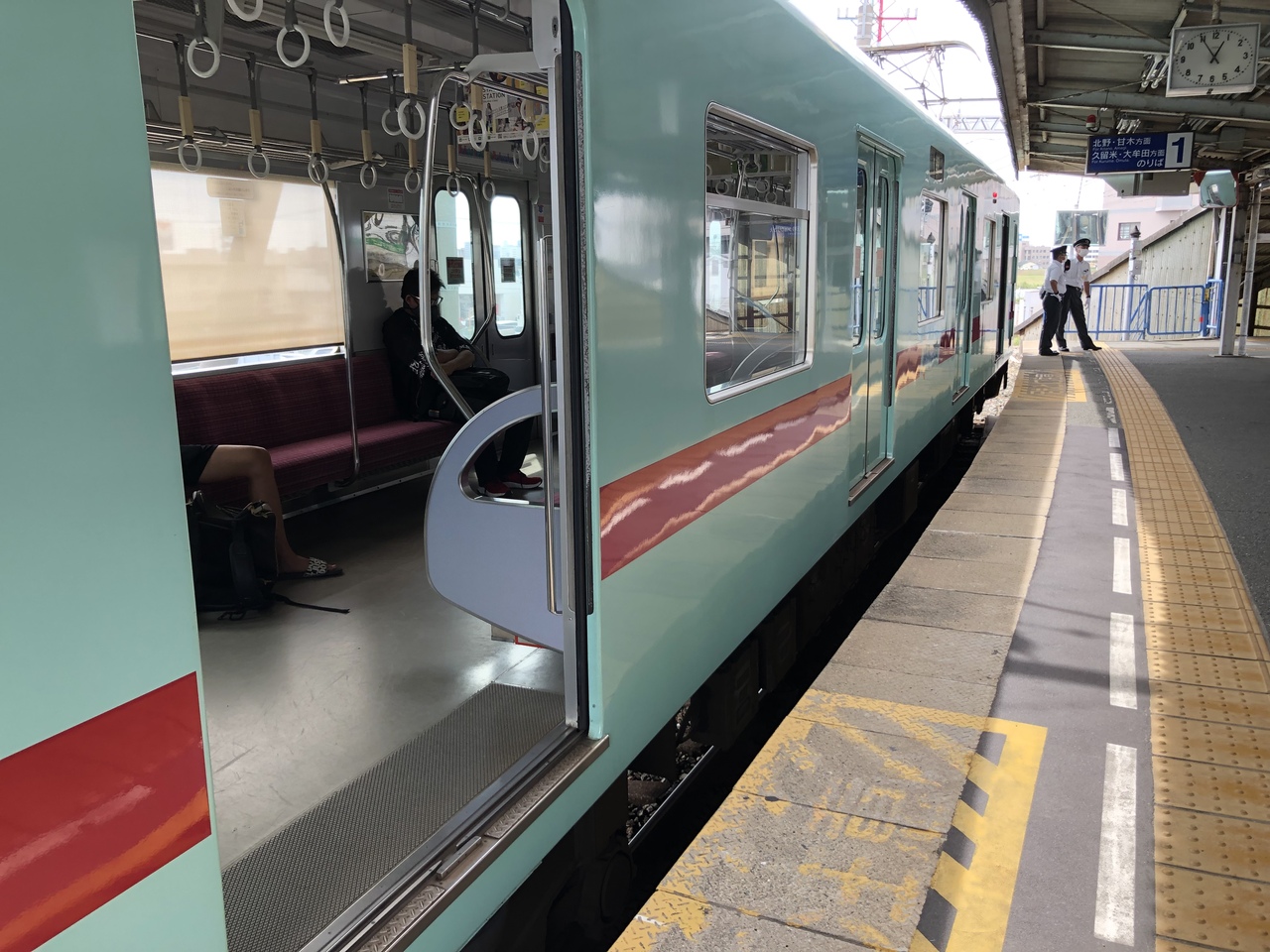 車両は、1989年(平成元年)までは、西鉄天神大牟田線の前身である九州鉄道が大牟田までの全線開通に備え、1937年(昭和12年)から導入した200系(当時はモ21系)という13m、2扉の軽量車両が、1948年(昭和23年)から用いられていた。しかし、冷房化ができず、老朽化もかなり進んでいたため、路線の改良が行われ、貝塚線と同じ600系に置き換えられ冷房化達成。さらに2003年(平成15年)からは4扉の7000系か3扉の7050系に置き換えられ、現在に至っています。- 旅行時期