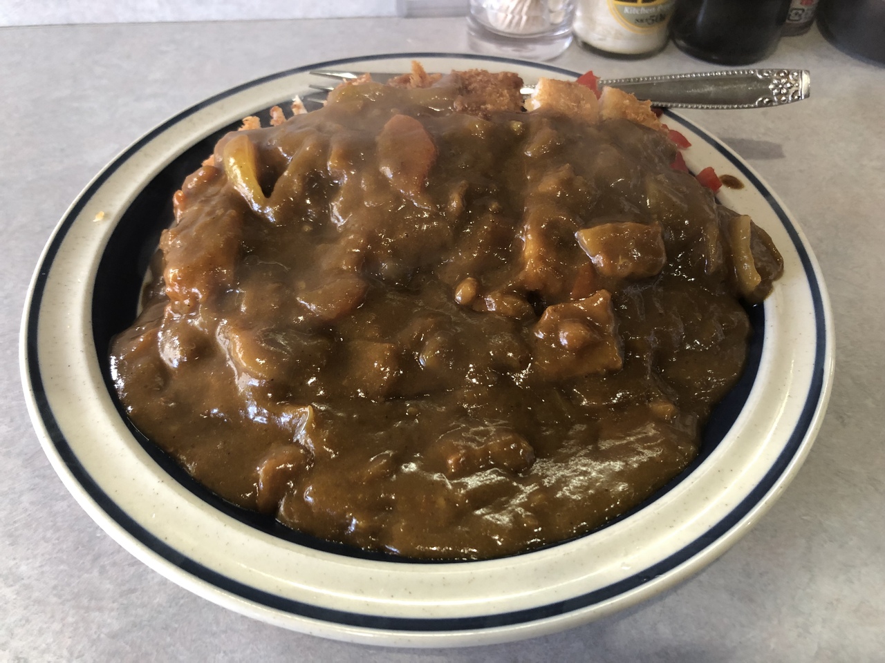 今回は一番人気だという「カツカレー」(630円)を注文。5分くらいして提供されたカツカレーは、少しスパイスの香がする家庭的なルーで、とろみのあるもの。ジャガイモ、ニンジン、玉ねぎなどは原形をとどめていました。とんかつを食べやすくということなのか、スプーンではなくフォークでの提供されるのも、どことなく懐かしさを感じさせる。とんかつのお肉は薄めですが、揚げたてのものでサクサクしており、これがルーとちょうど良い塩梅に。見た感じよりもご飯も盛ってあり、普通盛でもちょうどよかったです。ちなみに80円プラスで大盛に。- 旅行時期