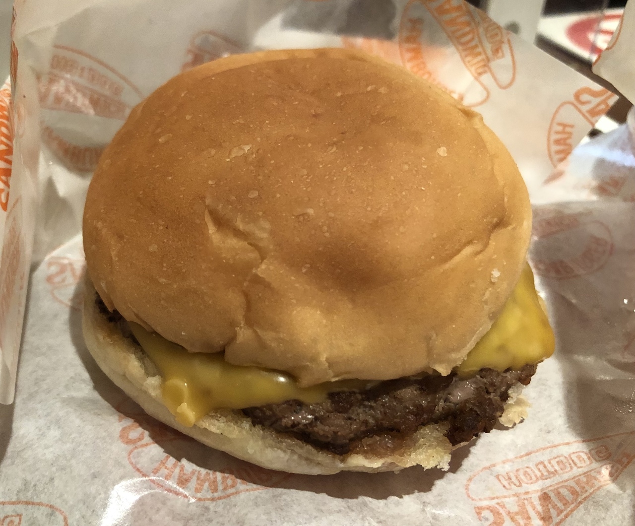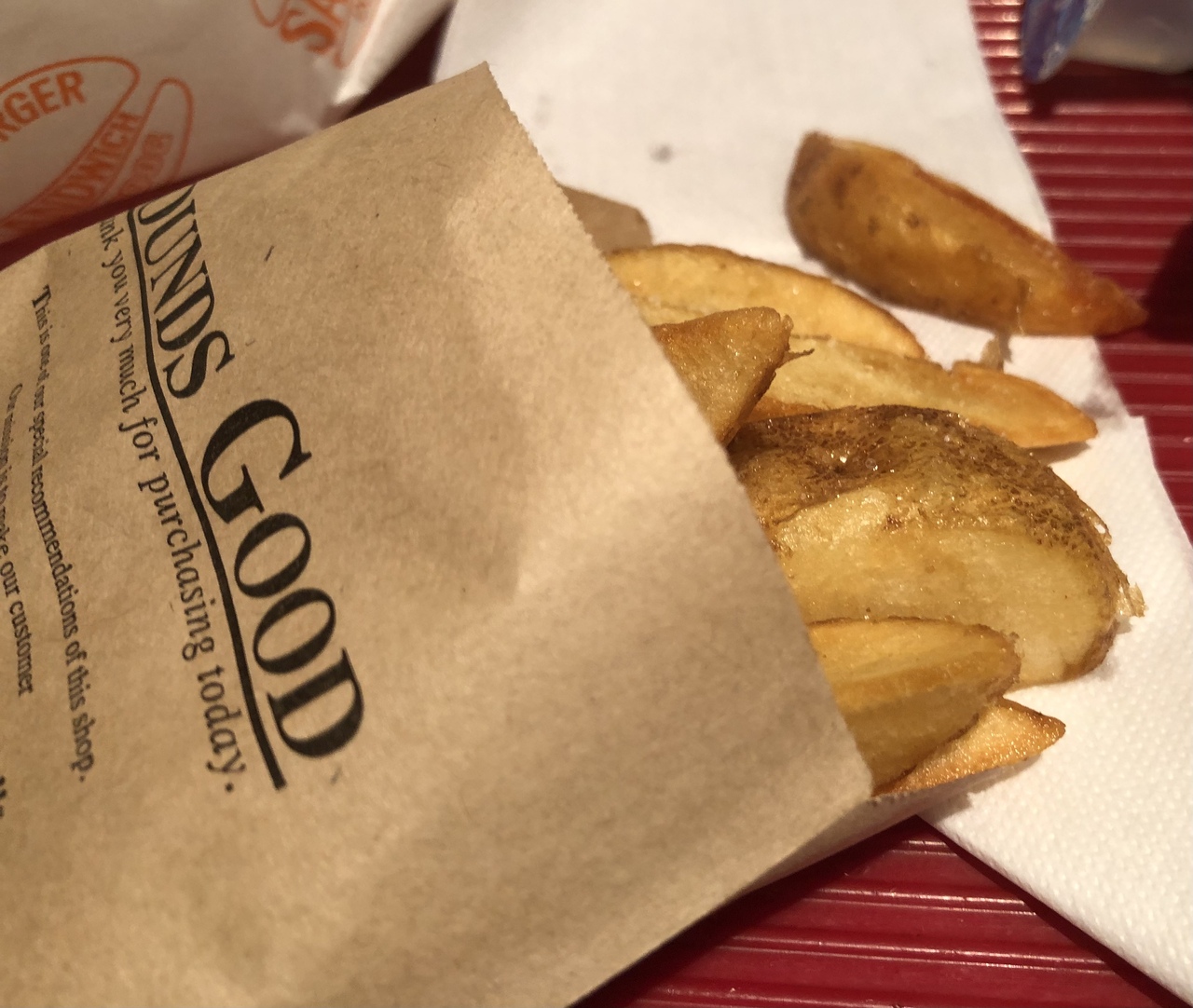 チーズバーガーのモーニングセット(ポテトつき)をオーダー。まず、チーズバーガーは、パテもしっかりしていてパンズも値段の割に頑張っている印象。手作り感があります。大手チェーンにはない揚げたてのポテトは、じゃがいもをざっくり大きめに切って揚げたもので、量も多く、あじはじゃがいもそのものの旨味が味わえます。