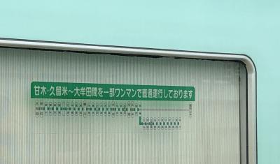 路線は宮の陣で大きくカーブし、しばらく築堤を走る。五郎丸を出ると九州自動車道と交差し、車窓は一変。水田が広がる。線路は直線で走り、途中「学校前」と言ったローカルっぽい名称の駅も通る。さらに、田畑、住宅地をのんびり走ると甘木鉄道が近づき終点甘木となる。甘木駅から甘木鉄道甘木駅までは徒歩5分くらいの距離。