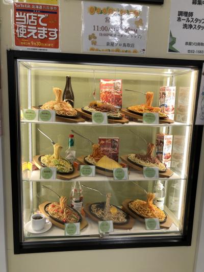 釧路駅から車で10分、バスで15分くらい、鳥取大通2丁目もしくは3丁目バス停、日本製紙釧路工場近く、共栄新橋大通沿いにある、アークス鳥取店の1階にある泉屋。こちらは本店やイオン内のお店と異なり、スパゲティ専門店。店名の「ソロ」はこの店舗形態からとのこと。食券機で食券を購入。本店に比べると質素な展開ですが、店員さんは数名いて、粉チーズやタバスコ、お水などを持ってきてもらえて、「このほか必要なものがあれば言ってください」と気持ち良いサービスも。