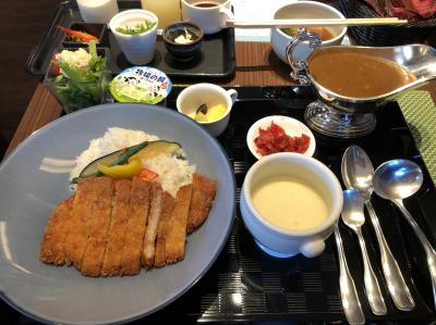 今回朝食で訪問。通常は和洋ブッフェですが、コロナ禍により和食または洋食セットから選択。チェックインの際に選択してほしいとのことで、メニューを見ると一般的な朝食パターン(北海道なので海鮮丼系もありました)に加えてチキンカツカレーが。これしかないと注文。