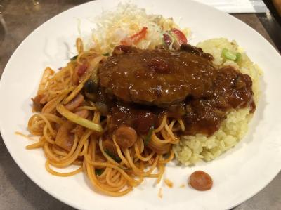もちろんメインは洋食で、トルコライスと和牛ハンバーグのメイン。トルコライスには、普通のトルコライス(トンカツ)、ハンバーグトルコライス、スペシャルトルコライス(ハンバーグとエビフライ)の3種類があり、普通のトルコライスが990円でスペシャルが1620円とかなりの価格差。今回はハンバーグが美味しそうなので、中間のハンバーグトルコライス(1220円)をオーダー。