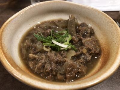 まずはビールとおつまみをオーダー。洋食のお店のはずですが、おつまみメニューを見ると、ドテ焼やら茶豆、トロサバの炙り、ゲソのバター焼き、揚げたてさつま揚げ、唐揚げ、ハルマキとまるで居酒屋。ビールのおつまみにドテ焼きを頼みましたが、煮込みのような感じ。味は少し薄め。