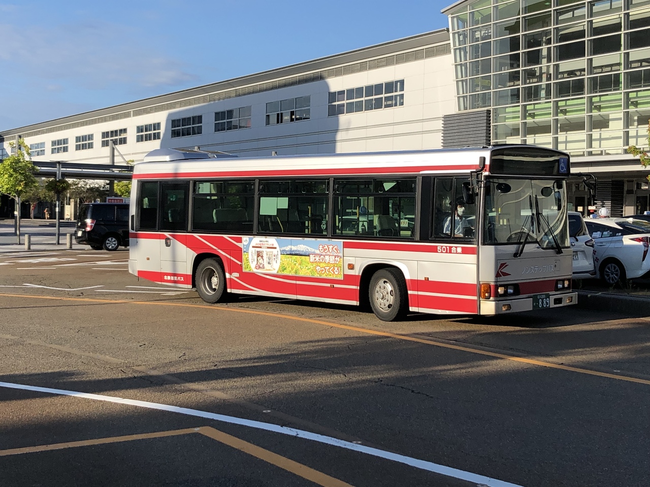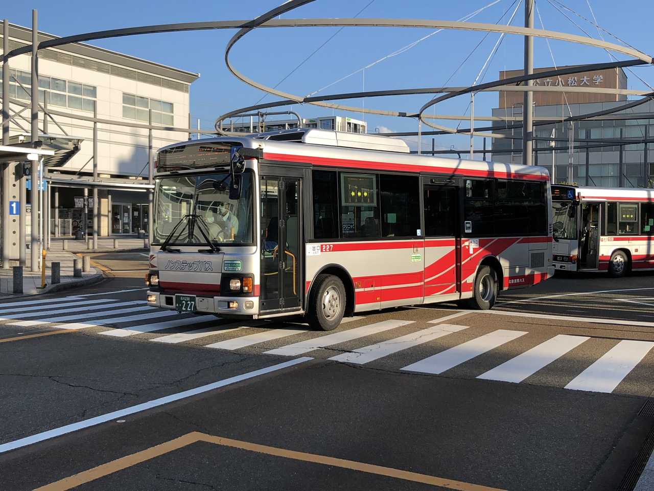合併後は、小松市内と加賀市内のバスを中心に運行。利用価値が高いのがJR小松駅から小松空港までの路線バス。朝6時55分から夜19時まで、EVバスも含めて概ね1時間に2~3本運行。小松駅駅から空港まで11~12分で結んでおり、金沢駅から空港までJRとうまく乗り継ぜれば50分くらい。北鉄バスの空港リムジンバスよりも安く行けるメリットはある。福井駅から小松空港までの京福バスがコロナ影響による運休のため、JRとのセットで利用しましたが、小松駅でも待ち時間もあまりなかったので、スムーズでした。