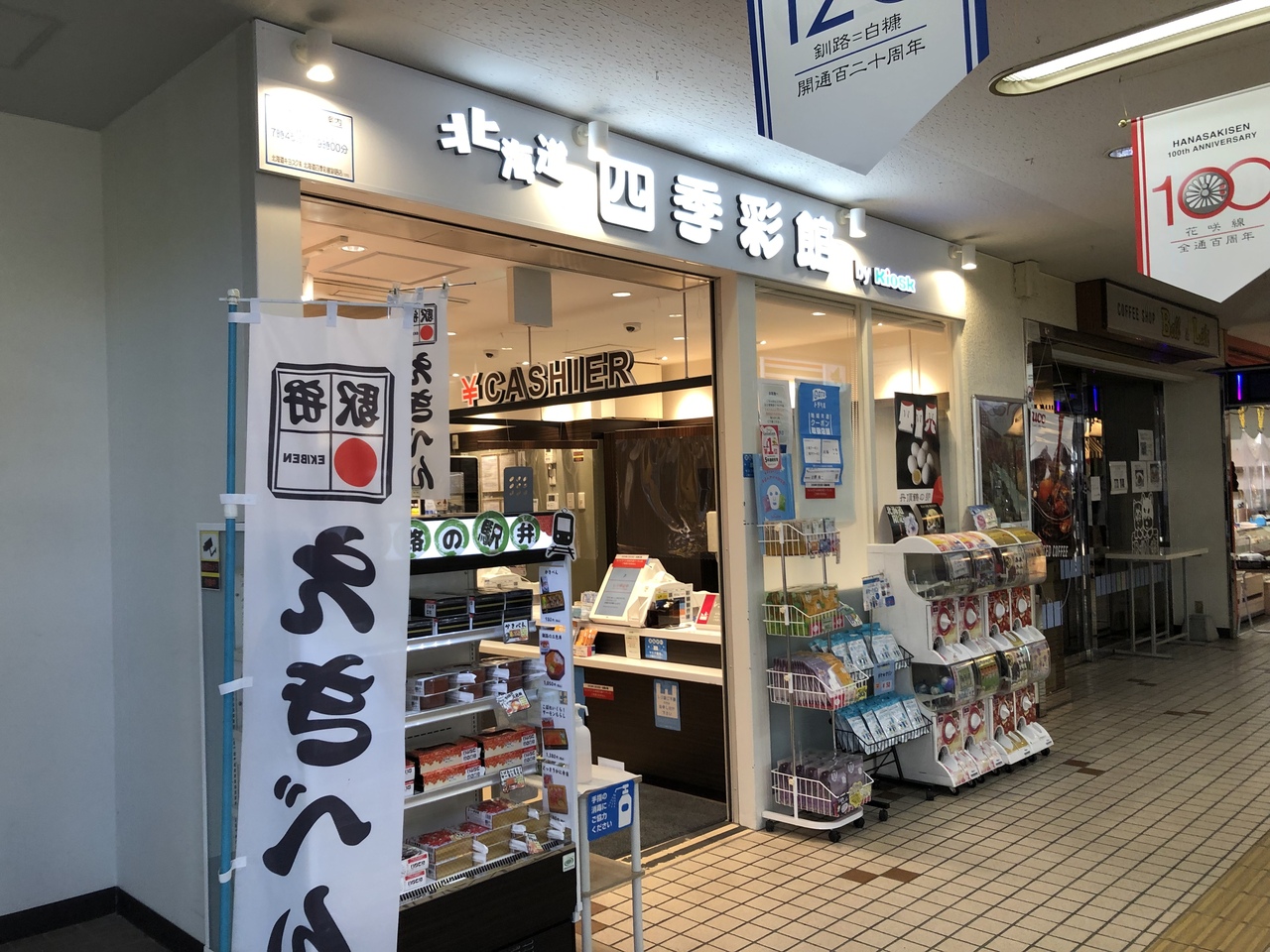 JR釧路駅構内にある土産物店。札幌駅にある四季彩館と比べるとかなりの小規模ですが、以前はセブンイレブンとの同居でしたが、現在は独立したので、お土産の種類も充実。お酒の種類も増えたほか、生物以外の釧路のお土産は大方揃っています。また、釧路駅の駅弁も販売。列車に乗る前に便利です。