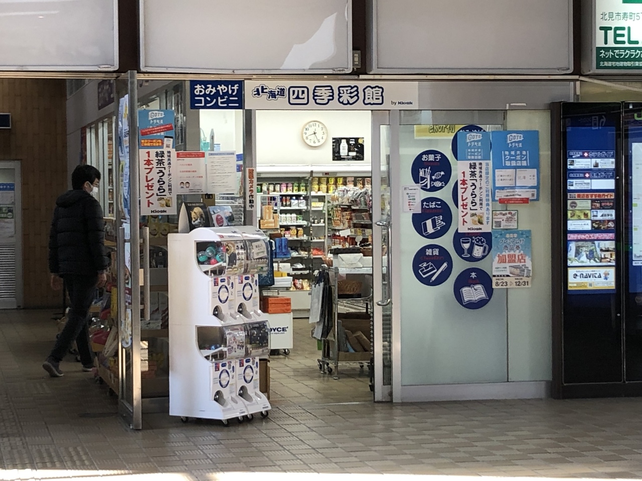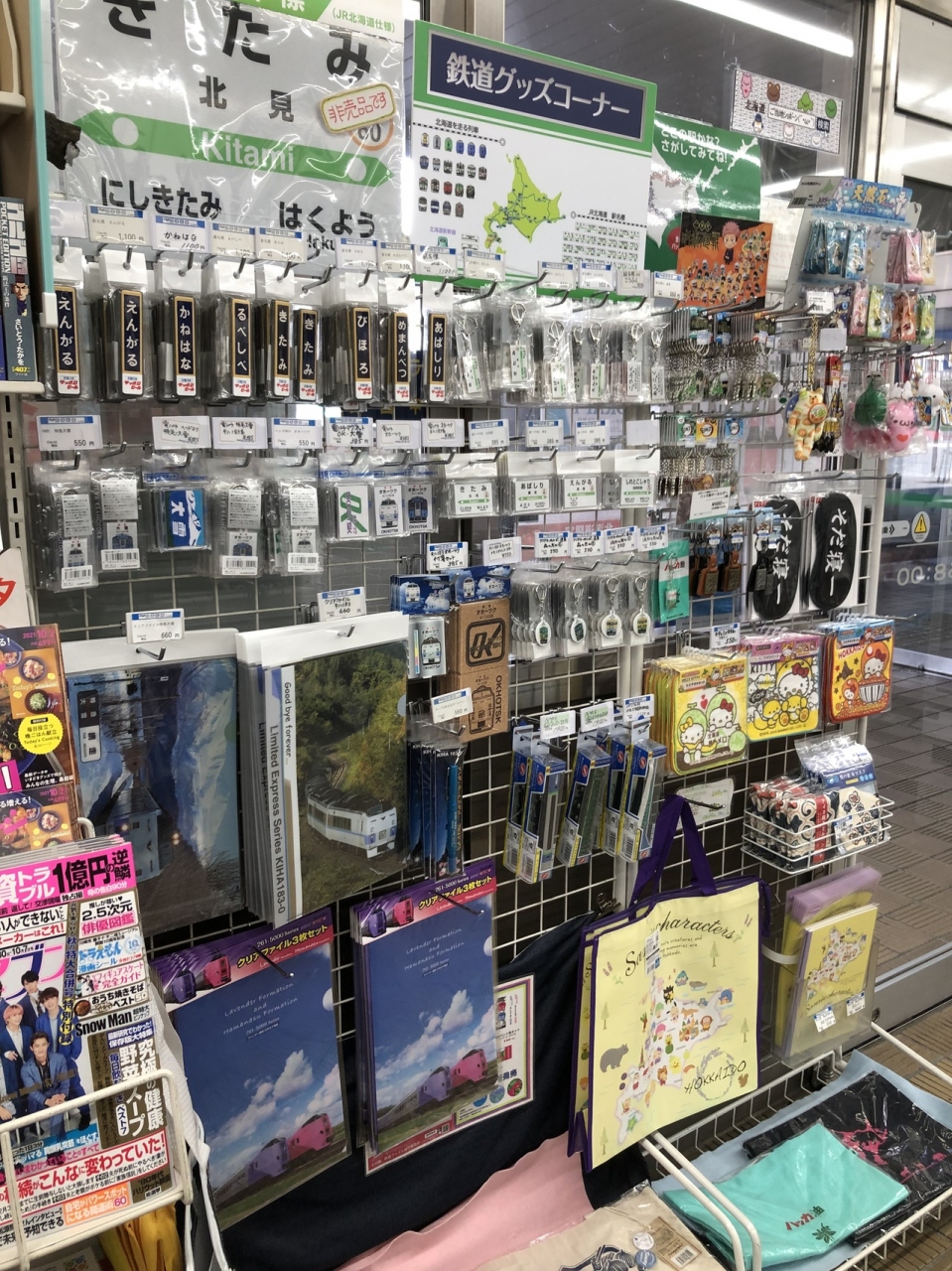 JR北見駅構内の北海道キオスク直営の土産物店。駅の待合室からも駅舎内、駅舎の外から入れます。駅の売店(コンビニ)もかねていますが、圧倒的にお土産物が多い。「白い恋人」はお菓子だけでなく、マグネットやキーホルダーなどオリジナルグッズや北見ではこちらだけの網走のお土産も売っています。また、北見の地酒「白杜の雫」をそれなりのスペースを取って販売していました。お馴染みのJR北海道の鉄道関連グッズもかなりありました。列車に乗る前に便利な存在です。