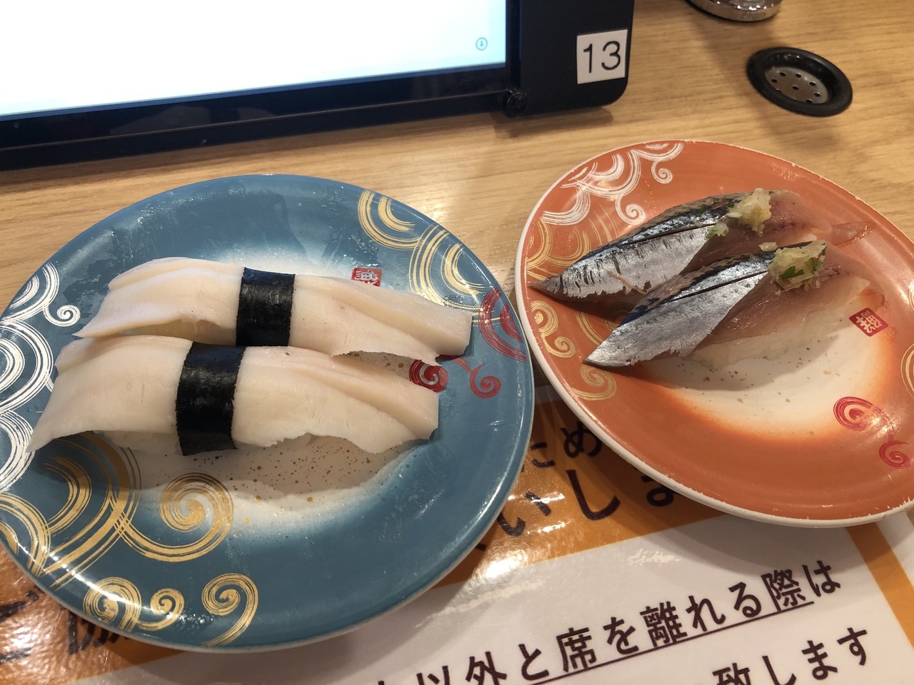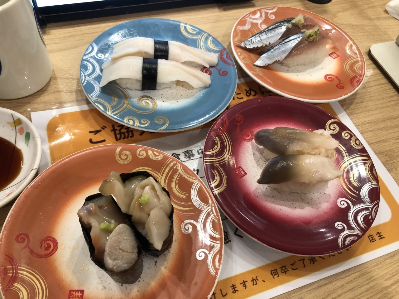 北海道の回転寿司は、道産モノがオススメ。今回は、たこ頭、道東さんま、ほっきのひも、苫小牧産活ほっき、たこの子、赤ほや、タコ足、ひらめのこんぶ〆、日高産活つぶをタイミングを見ながらオーダー。