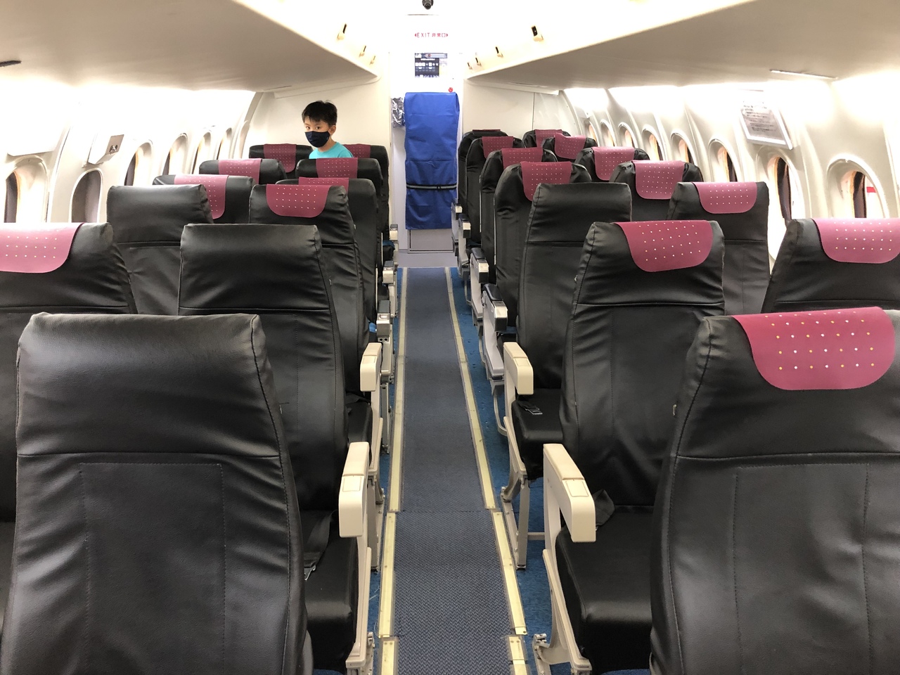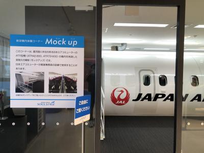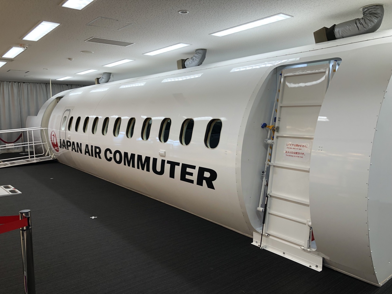 鹿児島空港の歴史や就航している航空会社の紹介、有名な航空機のモデルブレーン、パネルなど一般的な内容ものに加えて、本物のエンジンのファンやB747で使われていた翼のウイングレッド、タイヤ、ノーズカウル、さらには反転フラップ式案内表示器などが展示されており、ファンならずとも十分楽しめます。中でも、日本エアコミューター(JAC)が使用することもあるQ400型の外観のモックアップは必見。JACの機種更新に合わせて機内は最新のATR型風にリニューアルされています。