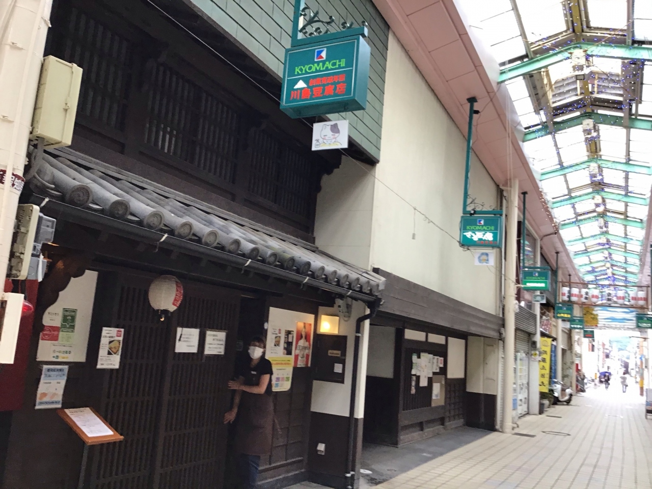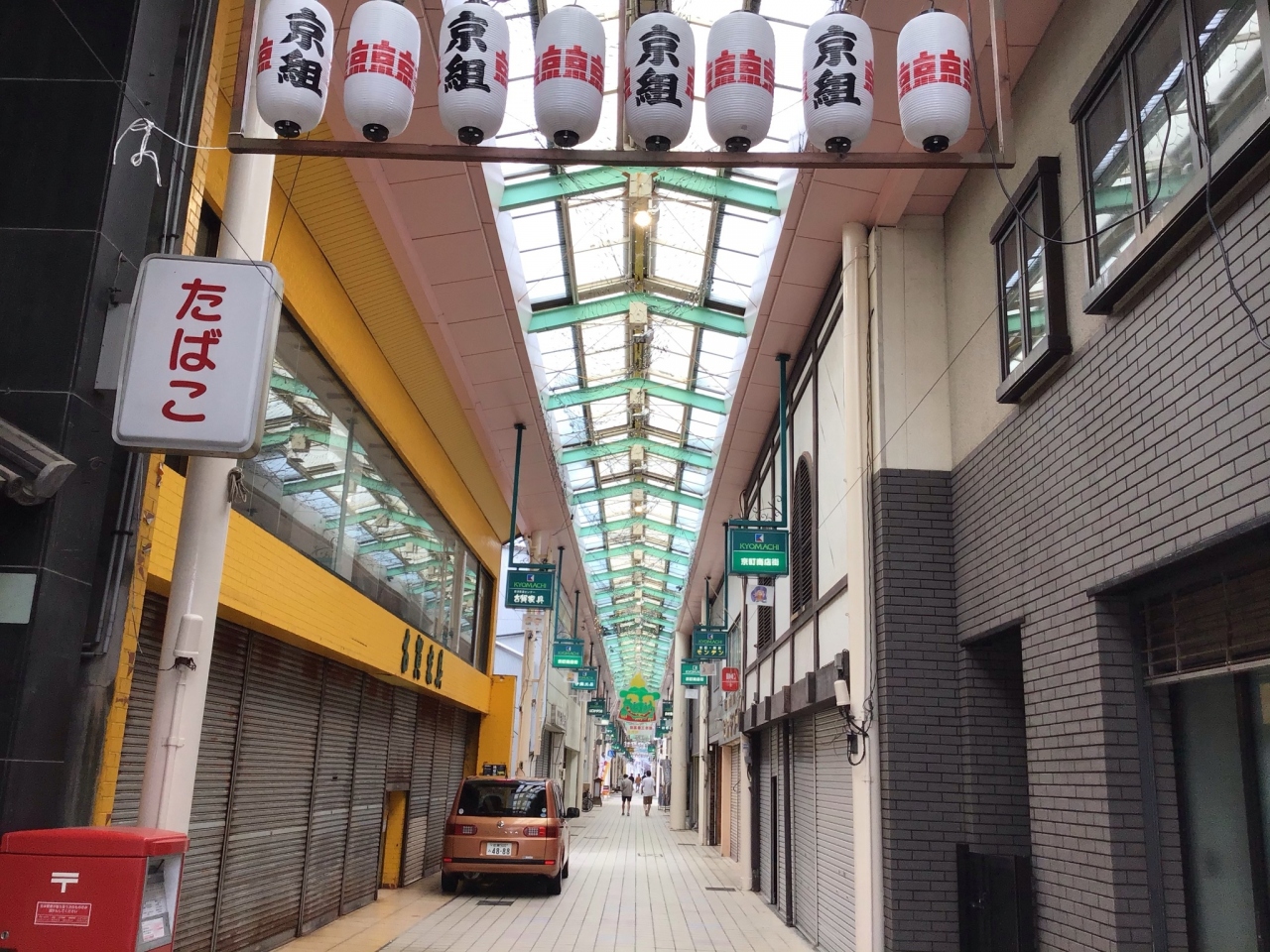 JR唐津駅前の呉服町入口から東に延びるアーケードのある商店街。刀町、中町、呉服町と京町の4つで構成される唐津中央商店街の一つ。え唐津は唐津藩の城下町として栄え、明治に入り石炭積出のため鉄道が開通し賑わった街でした。京町商店街は、昭和46年にアーケードができ栄えてきましたが、近年、大型複合施設の開業などにより、空き店舗が目立ちます。しかし、創業200年のミシュランガイドにも掲載されているざる豆腐店や、歴史ある木造建物の鰻店、久留米がすりの婦人服店、昔ながらの薬局など最近なかなか見かけることの少ないお店が営業しています。
