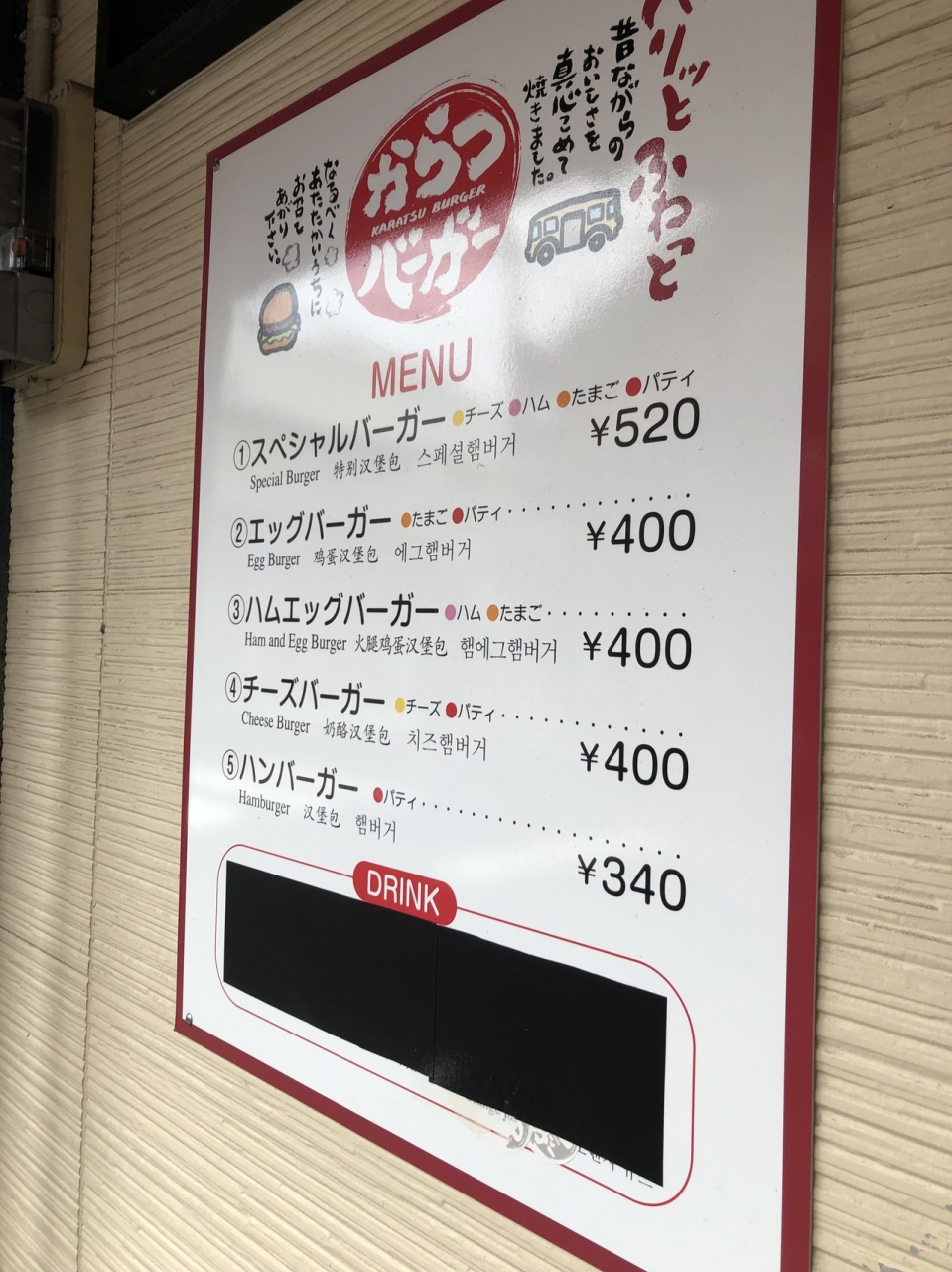 唐津のご当地バーガー「唐津バーガー」のお店。市内中心地の大手口にある路面店で、お店の横に椅子があるので、食べることはできるかもしれませんが、それなりに車の通る商店街にあるので、ここで食べるのは恥ずかしいかも。とはいえ、近くに公園があるわけでもないので、観光客向けというよりは、地元向けかもしれません。