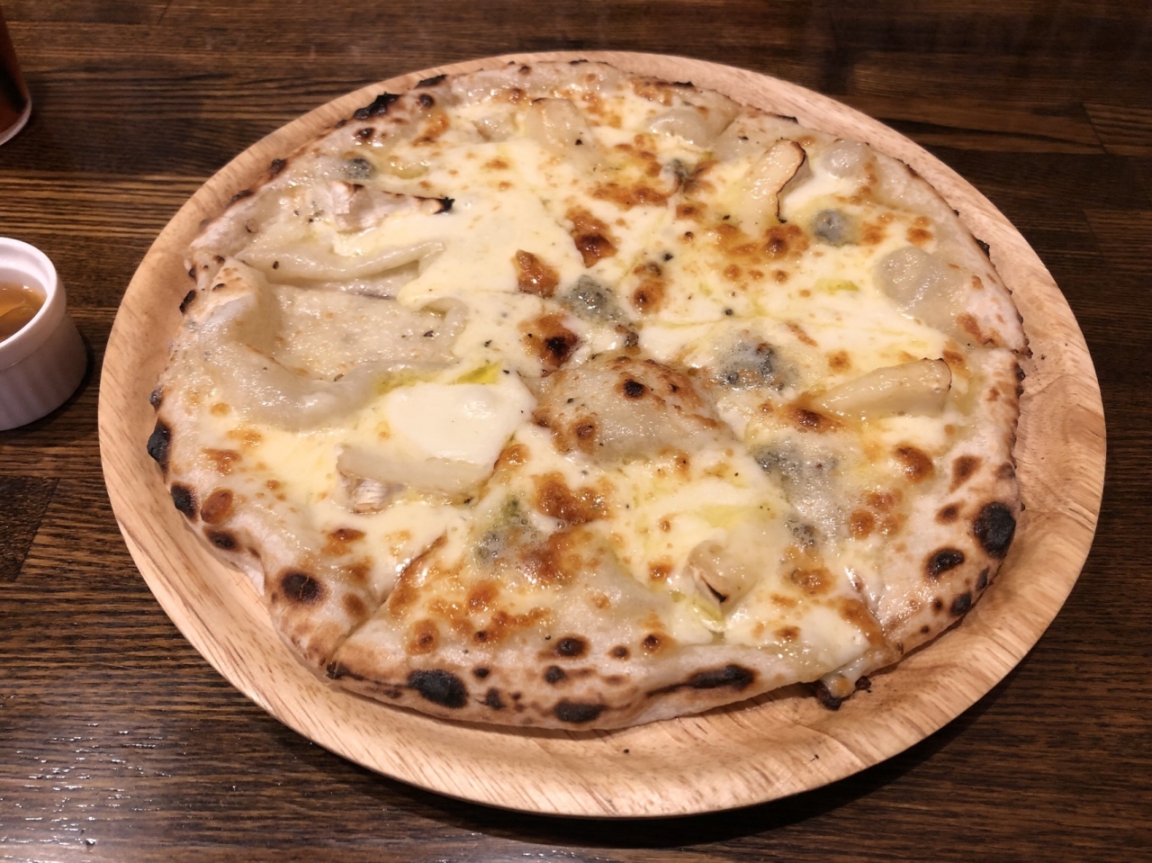 二回目の訪問で食べたピザは、パレットを使用した専用の窯で焼き上げられており、モチモチ感のある生地は、程よい弾力があります。今回は、オススメの4種のチーズのピザにしましたが、カマンベール、モッツァレラ、ミックス、ブルーチーズが雑妙な塩加減に合わさっていて絶品。蜂蜜をかけると味変して、これまた美味。