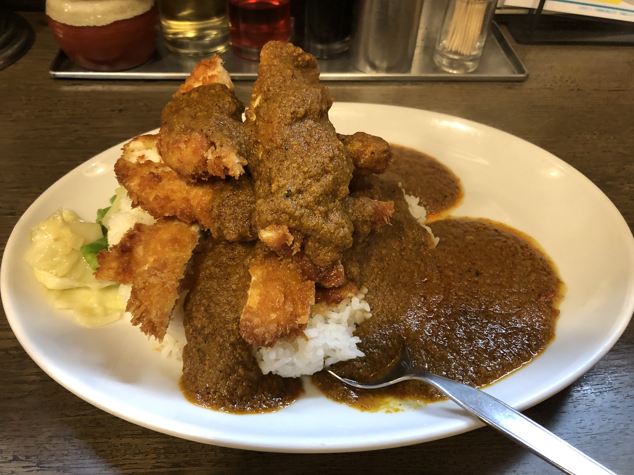 片山交差点からすぐ、産業道路沿いにある定食店。餃子、つまみ、中華料理、坦々麺やラーメンとなんでも揃うお店ですが、名物は「マウンテンカリー」。メニューにはイメージの絵が描かれているのですが凄さを感じる。お店の方いわく、並盛りで大盛りレベルとのことで並盛りを注文(大盛りはご飯が+100gで、チキンカツが一回り大きくなるとのこと)。数分後、到着したマウンテンカリーは、そのビジュアルに驚く。カレーは、スパイスがかなり効いていて後から辛さがかなりある。肉と香味野菜をたっぷり煮込んでスパイスを効かせた手作りルーのカレーで、本格的なインドカレー店で出されるようなカレー。思った以上に本格的なインドカレー。業務用のルーは使っていないとのことだが、家庭ではなかぬか食べられない味。しかも山盛りのチキンカツはインパクト大。カツにはルーがちょうどよいあんばいにかけられている。カツは少し冷めていて、ジューシーさはあまりないが、カレーと合わせるから許せるかな。辛さが後に残るので、卵スープがありがたい。大盛りにしなくて良かった。