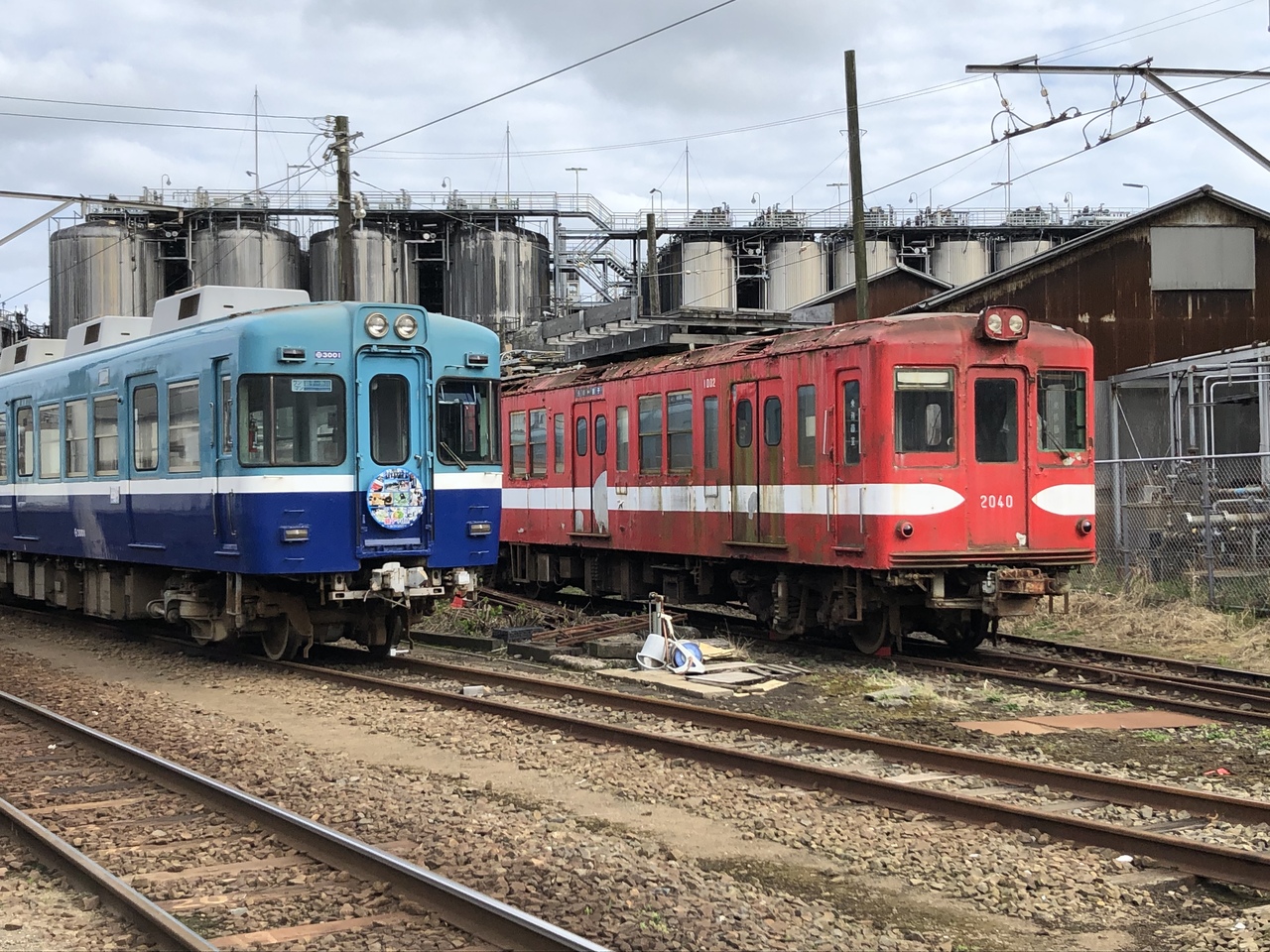 車両は、電車6両、電気機関車1両が在籍。以前は、銀座線や伊予鉄道からの譲渡車両が単行で走っていましたが、現在は伊予鉄道から譲り受けた元京王の車両で統一されており、全車冷房車。ただし、変電所の容量問題により、銚子駅と外川駅の停車中のみ使用。カラーは当初は京王時代のライトグリーンやラッピングカラーなどでしたが、現在は元京王2010系(元伊予鉄800系)の2000形が大正ロマン電車と銚電復刻カラー、元京王5100系(元伊予鉄700系)の3000系が澪つくしカラーで走っています。また、外川駅には、元伊予鉄100系のデハ800形が銚子商業高校のプロジェクトの一環で修復され、無料公開されています。