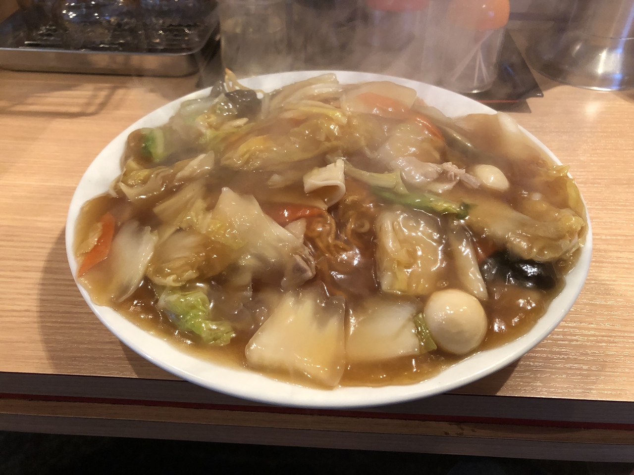 普通盛り、メニューによっては小盛りもありますが、コスパが良いのはジャンボシリーズ。今回は「あんかけ焼きそばジャンボ」を注文。待つこと5分くらい、運ばれてきた焼きそばは、直径25センチ超の大皿に、1.5玉の麺にアツアツの餡がかかっている。湯気がすごくてなかなか食べ進まないのが難点だが、昔、よく食べた焼きそばを思い出させる懐かしい味。麺はしっかりと焼かれていてパリパリ。餡は醤油味で少し濃いめ。具材は海老、烏賊、白菜、木耳、豚肉、筍、絹さやと一般的だがうまくまとまっている。餡も量も半端ない。食べ終わったらかなりの満腹。満足感ありのお店。- 旅行時期
