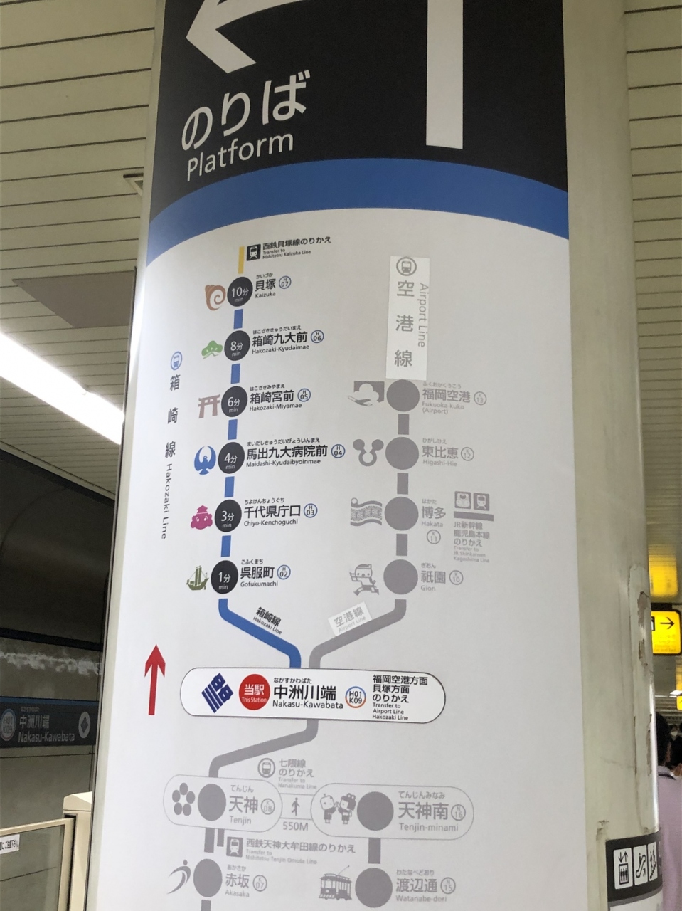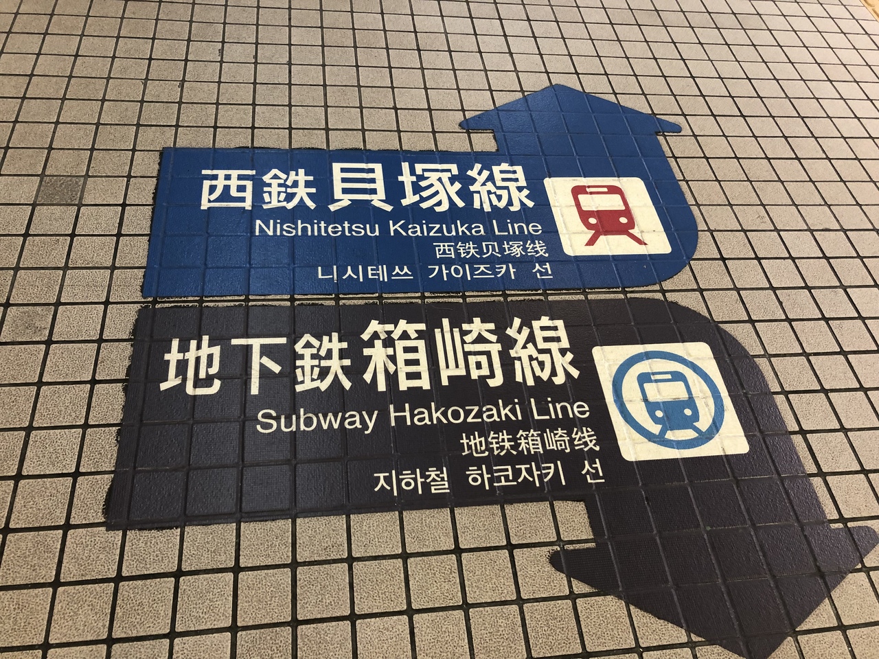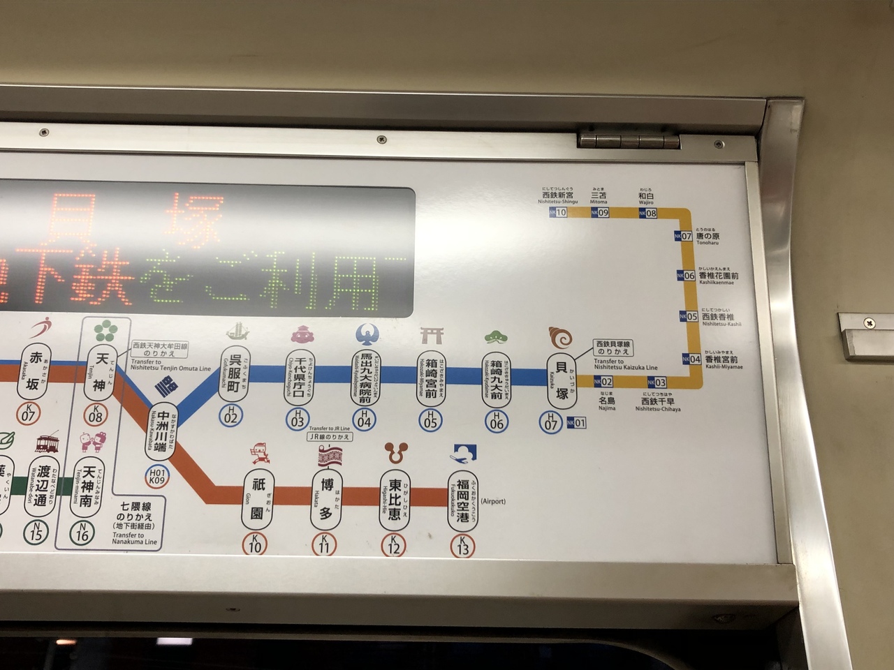 貝塚では、2~3分の時間で西鉄貝塚線と接続しており、時刻表にも貝塚線の終電の接続する旨が記載されています。1971年に地下鉄箱崎線の新設が盛り込まれた当時から貝塚線(当時は宮地岳線)の直通運転構想はあり、以来50年、議論・検討されています。1997年には福岡市と西鉄が直通化に向けて合意し検討されてきましたが、最新の試算では年間赤字が2.6億円とされており、また車両の整備や貝塚駅の多額な改修費用、貝塚駅での連結作業による時間短縮効果が薄いなど、実現は遠い印象。確かに2両編成のローカル電車と都会的な6両編成の地下鉄にはギャップがあります。- 旅行時期