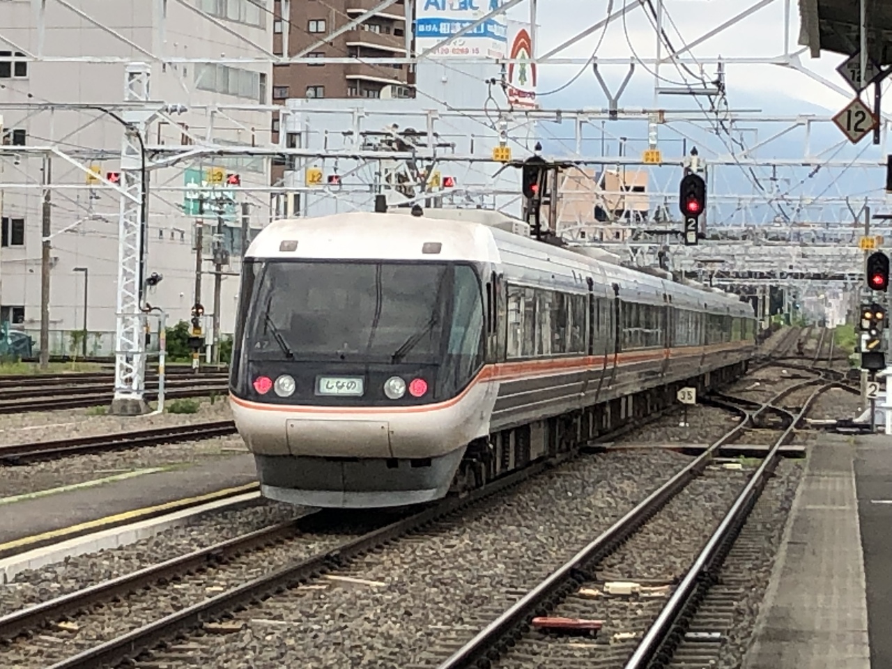 山間部を縫って走るので、カーブ区間で車体を傾斜させる装置があり、スピードアップを図っていますが、最高速度が時速95キロに押さえられていること、一部単線区間が有ること、東京~高尾間は快速電車と同じ線路を走行することなどから他の在来線特急と比較すると速いとは言えず、最速の列車は、下りは新宿11時発の17号で松本まで2時間25分、上りは10時10分発の18号で新宿まで2時間23分。八王子、甲府、茅野は全列車が停車しますか、そのほかはランダムで、立川、上諏訪、岡谷、塩尻は多くの列車が停車します。号数は、同じ中央線を走る甲府行きのかいじ、富士急行直通の富士回遊との通し番号。下り3号、上り44号は富士回遊と併結運転。