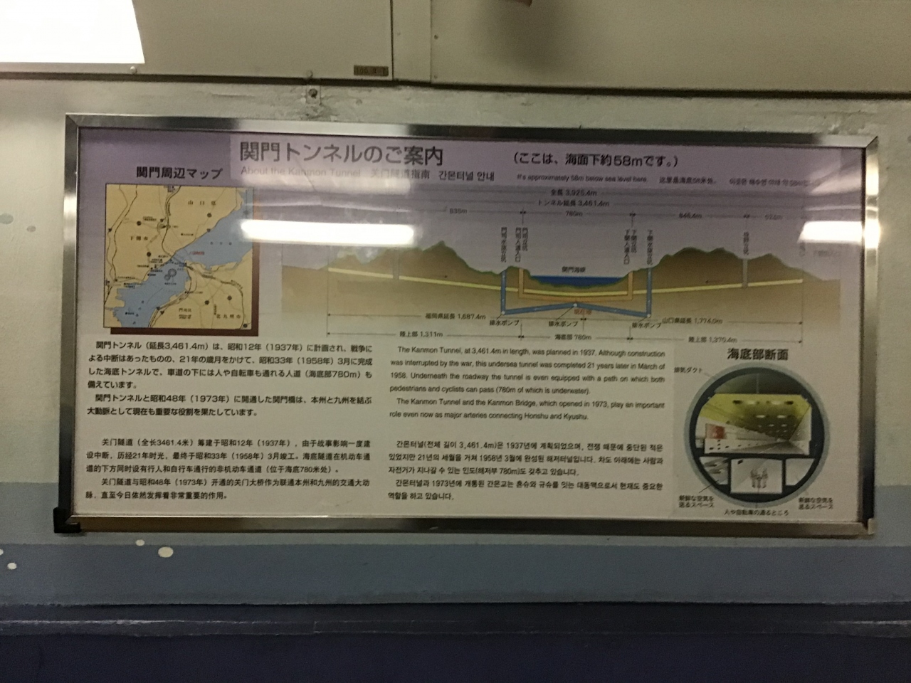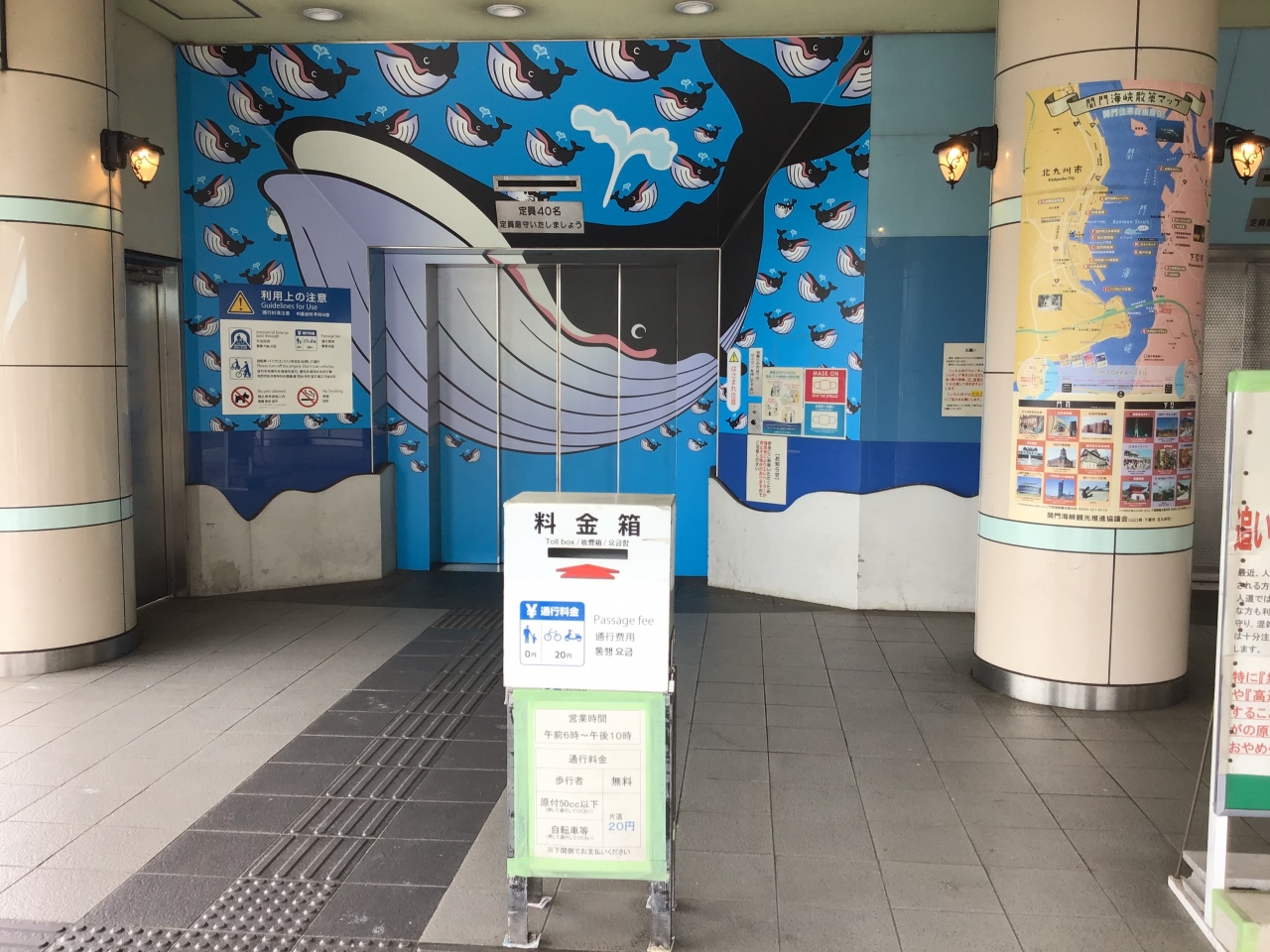 人道トンネルの入り口はそれぞれエレベーターがあり、自転車も原付もこちらに乗車。海底トンネルなので少し蒸し暑さを想像したのですが、適度に空調が効いているのか、それほどの暑さは感じませんでした(6月)。一本道で、県境を境にすり鉢状の緩やかな坂道になっており、原付や自転車を押しながら歩くのは少しきついかも知れません。ジョギングをされている方をよく見かけました。歩行者は無料、自転車や原付は20円で、下関側で料金を支払います。15分で渡りきれますが、「本州と九州はこんなに近かったのかと」再認識しました。- 旅行時期