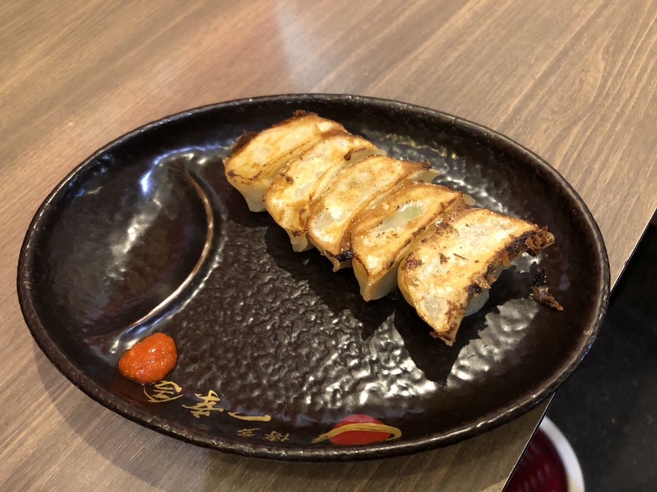 餃子は博多名物の一口餃子。ラーメンと比べると特徴が薄いが、もみじおろしが良いアクセント。- 旅行時期