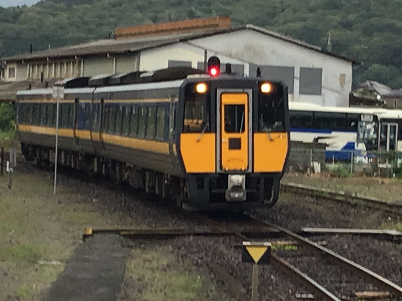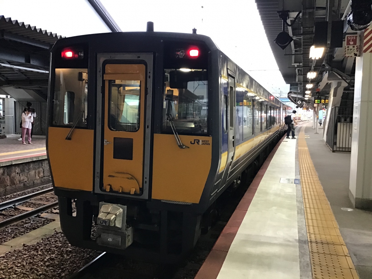 カーブや勾配が多いことから、JR西日本の山陰線高速化プロジェクトで開発された新型制御付振子気動車であるキハ187系が用いられており、指定席車と自由席車の2両編成が基本。多客時は増車されることがあります。先頭部が平らであるため特徴のないデザインですが、客室空間を出来るだけ多くし機能性を全面に出したものだとのこと。山陰の海と陽の光をイメージしたカラーリングは他にはないもの。車内はノーマルな座席てすが、手すりや窓枠には木質系の素材が使用されていて暖かみを感じます。