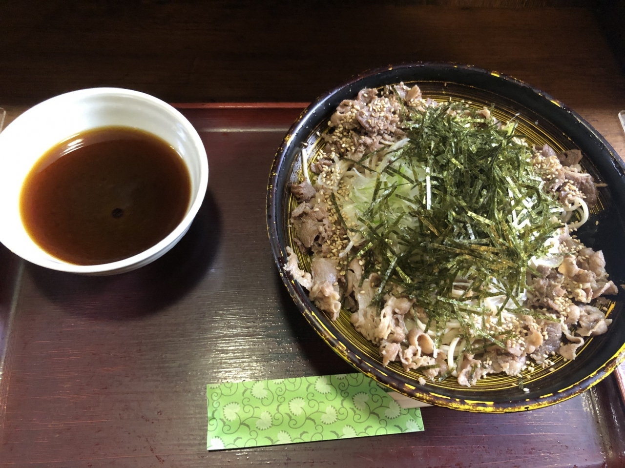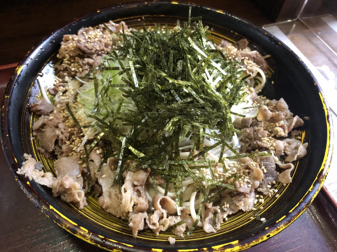 本格的な二八そばで、艶のあり、適度なコシがあって340円で食べられる、もりそばのクオリティではないレベルの高さ。そこらの蕎麦専門店よりも上かも。たくさん盛られたお肉は、牛肉で、少しパサパサしていますが、ラー油入りのピリ辛の甘さの汁につけるとまぁまぁイケる。ゴマとネギがたくそんのっていて、蕎麦と汁の相性も悪くない。