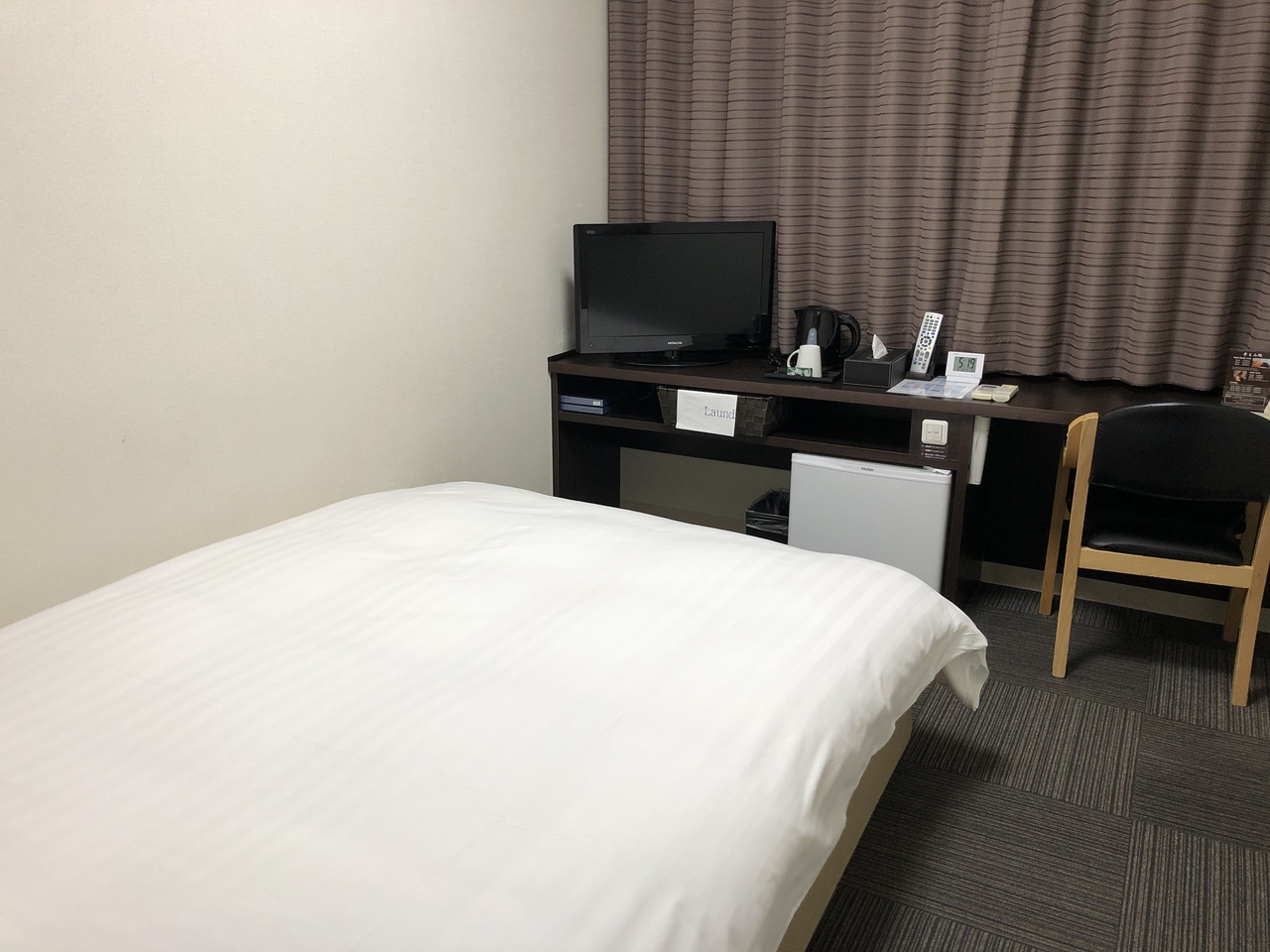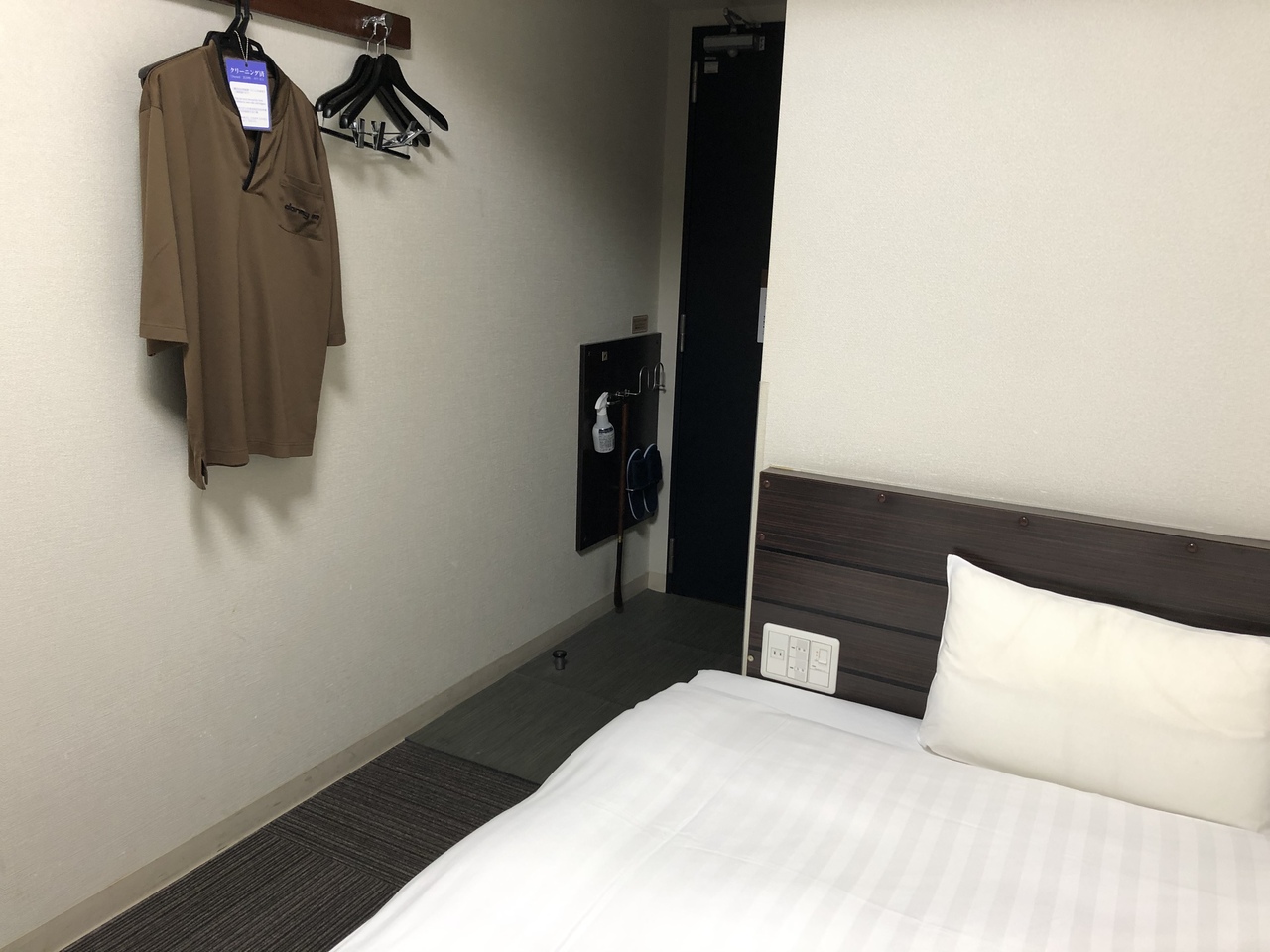 客室数165室、シングル中心のホテルで、一番多いタイプのシングルルームは広さが15㎡あり、ベットもシモンズ製のダブルバッドで快適。大浴場があるので浴室はありませんが、空調も個別で設備も必要なものは揃っています。