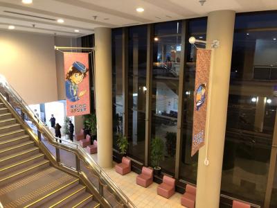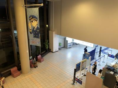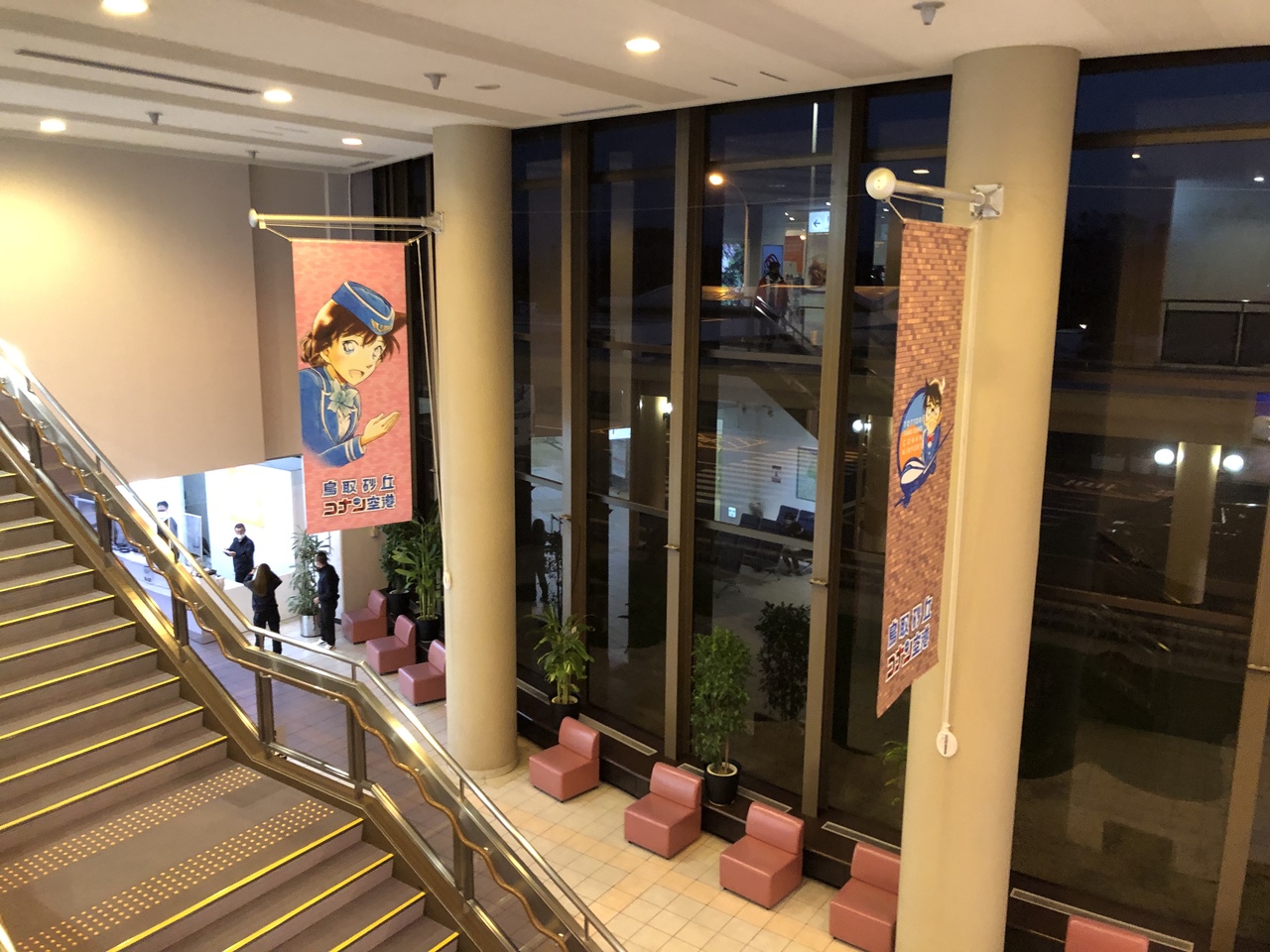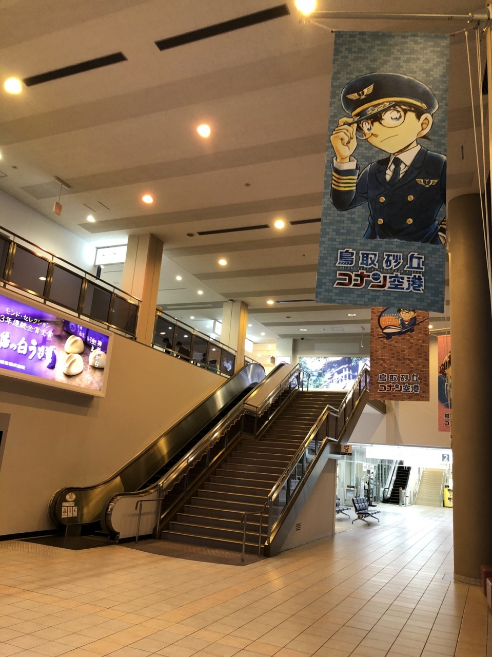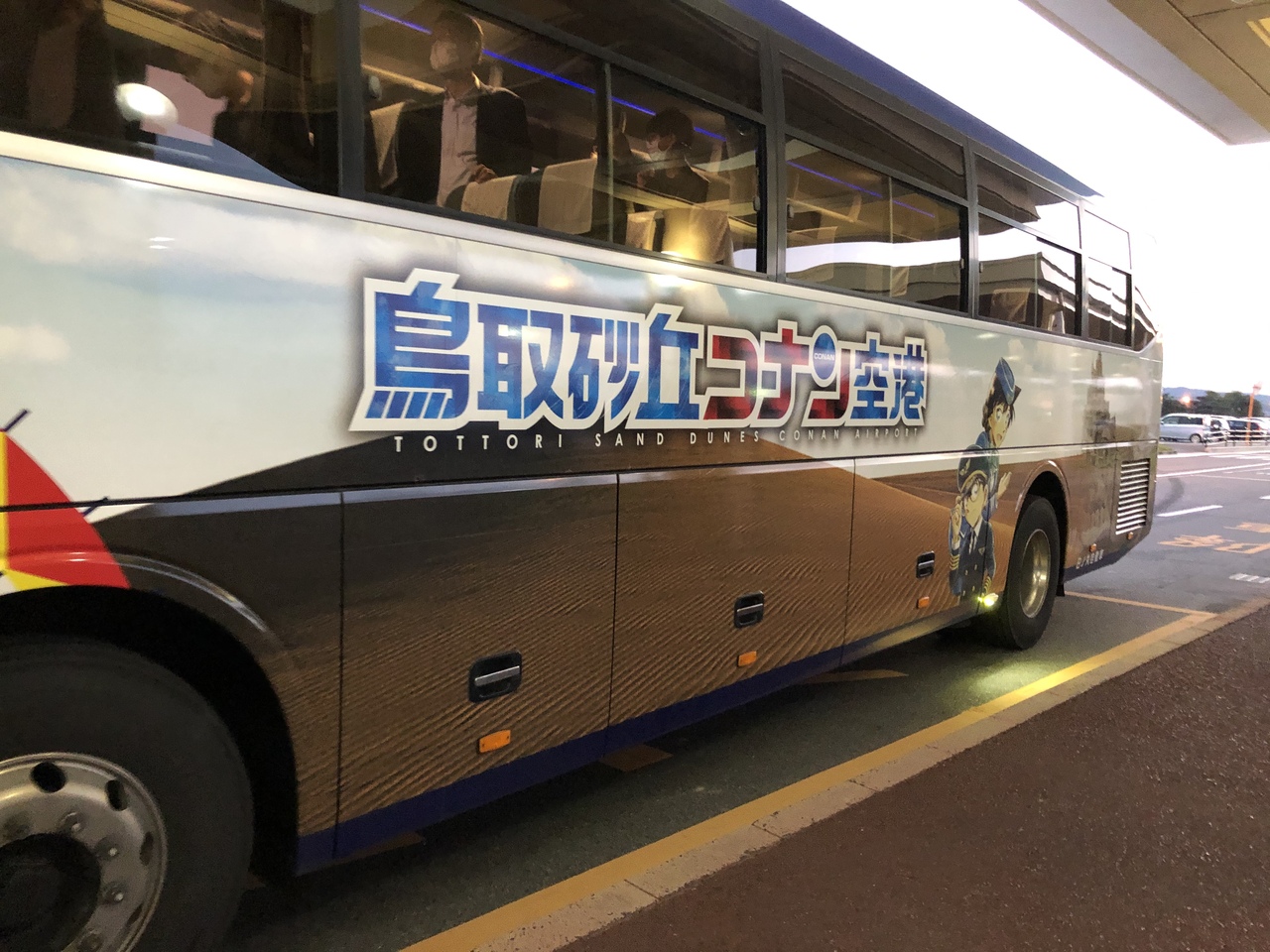 愛称の「鳥取砂丘コナン空港」の通り、地元鳥取県北栄町出身の漫画家、青山剛昌さんが描く漫画「名探偵コナン」のキャラクターのイラストが至る所に描かれており、撮影スポットの多い。また、トリック体験ができるゾーンもあるとのことですが、バスを使う場合、見学する時間があまりないのが残念。空港のサインは名探偵コナンで使用されているフォント、飛行機を降りてから使うタラップには名探偵コナンのアートギャラリーになっているなど、ファンとしてはたまらないと思います。