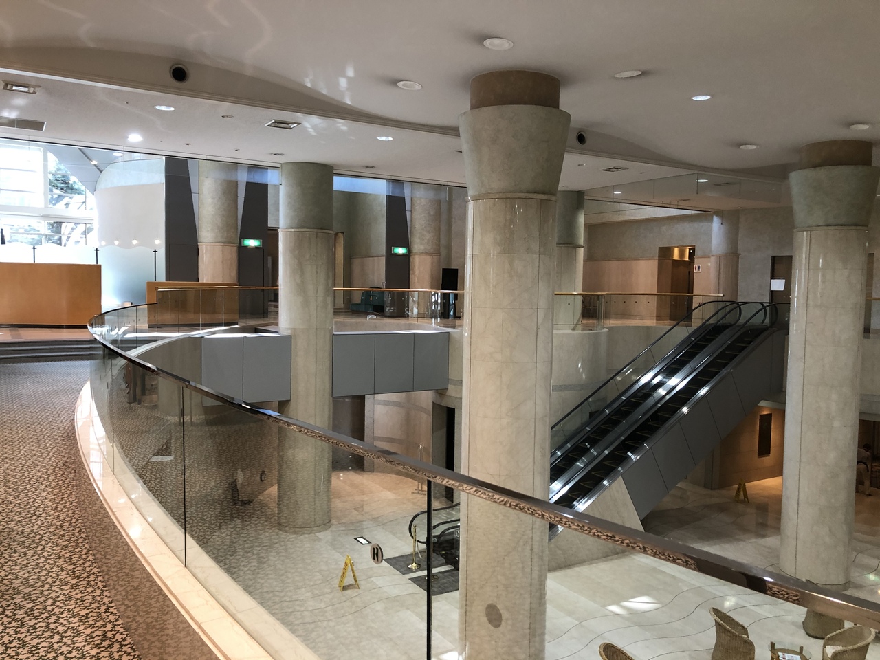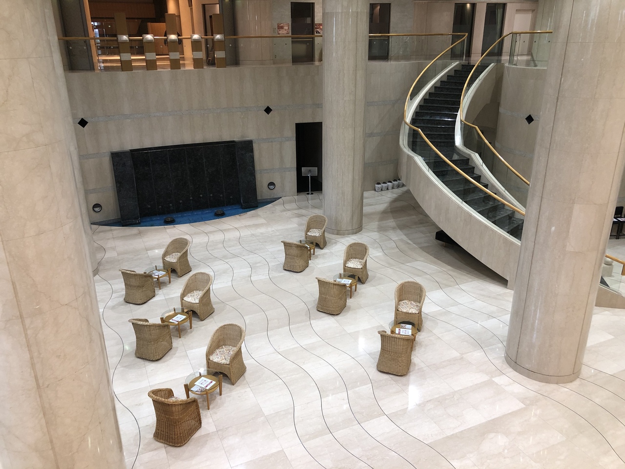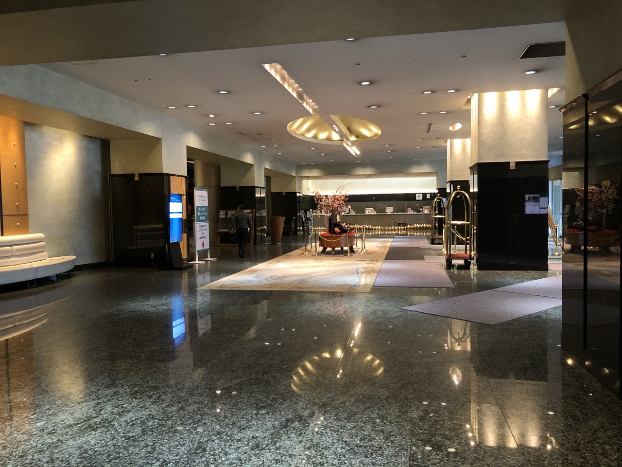 大和ハウスグループの大和リゾートという会社が展開するホテルの中で唯一、都心部にあるホテル。地上20階建の建物なので、駅の外に出るとすぐわかる。1992年に、コンベンション施設として建てられたホテルなので、比較的古いホテルですが、エントランスは広々としていて、落ち着いたインテリア、照明、さらには中央に花が飾られているなど豪華さがあります。