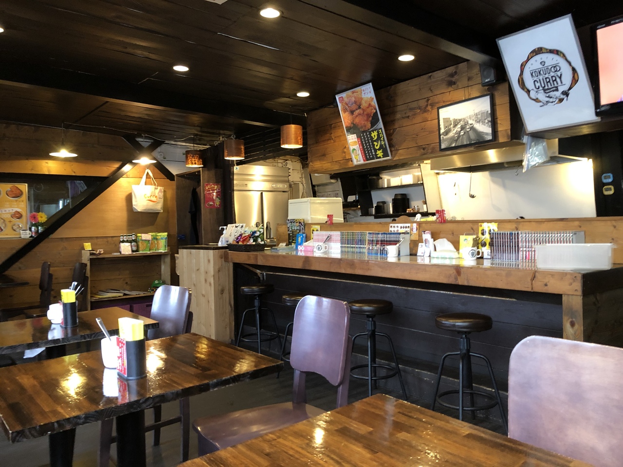 店内では、誰もが知っている洋楽が流れ、テーブルもインテリアも山小屋風。少し古めの札幌市内の写真が飾っておりお洒落。カウンター席には漫画本も置いてあり、時間を外せば^_^ゆっくりとした雰囲気でカレーがいただけます。
