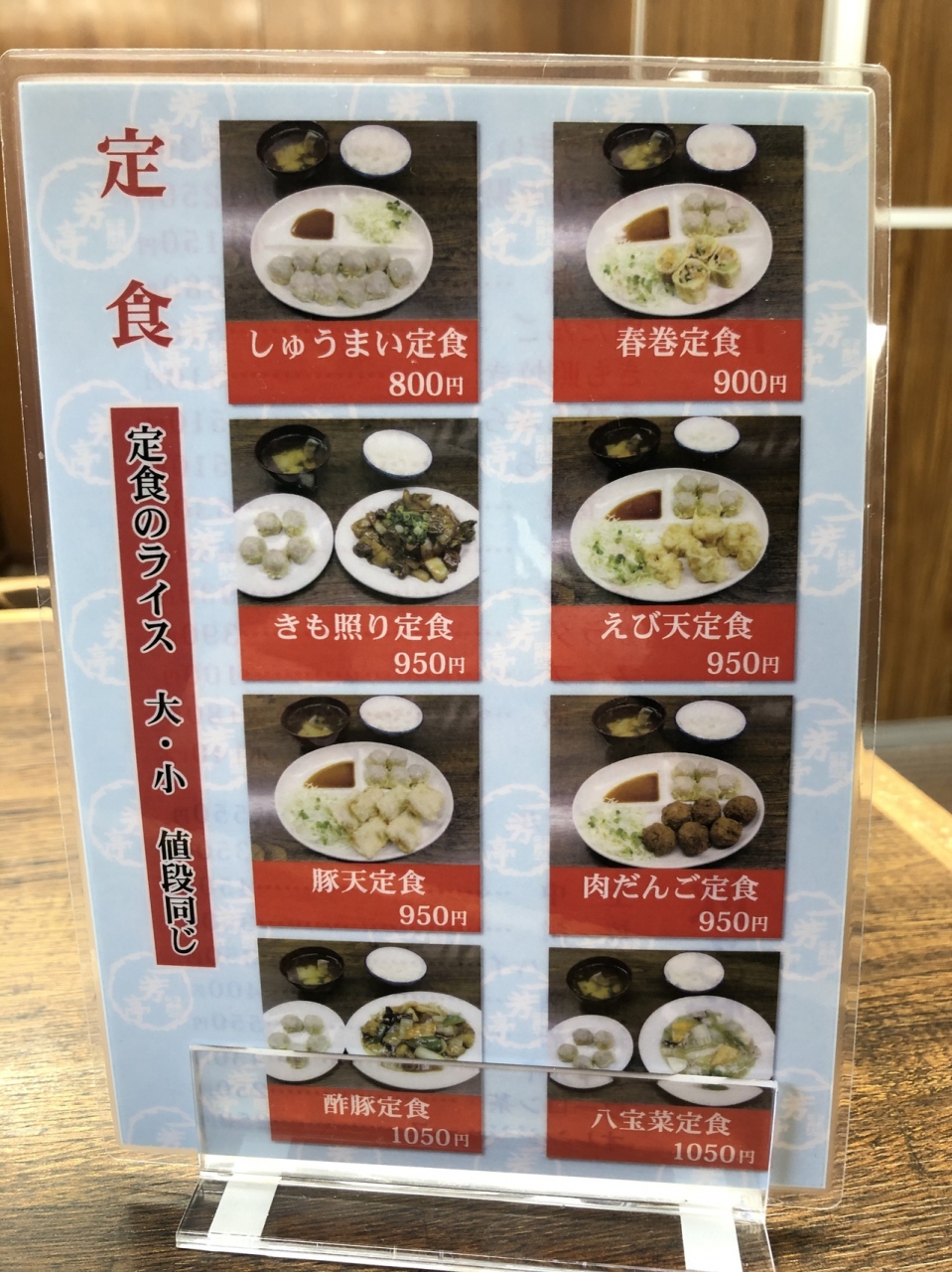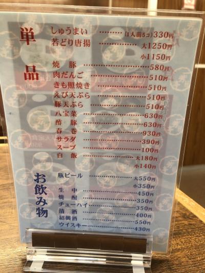 定食には一人前の「しゅうまい」(5個)がつく。店員さんに「お店のオススメは?」と聞いたところ「なんでも美味しいです」とのことだが、「豚天定食」をオーダーとしたところ、小声で「これが一番一番オススメです」と言われてほっと。豚天は、肉の柔らかさが、際立ち、衣もちょうど良いあんばい。スープば全体的に薄味の中で塩味が効いていて、豚肉と筍の出汁がうまい具合に効いていて美味一番。定食の場合、ライスが大・小、値段が同じなのは嬉しいサービス。- 旅行時期