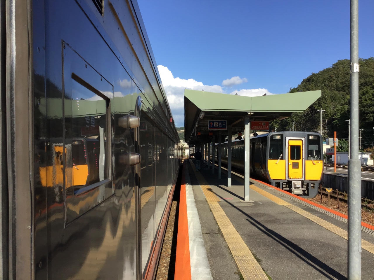 山陽本線上郡(兵庫県)から大原(岡山県)を通り因美線智頭(鳥取県)までの56.1キロを結ぶ、全線非電化の第三セクター路線。山陰・山陽連絡線の一つであり、京都~鳥取・倉吉間を走る「スーパーはくと」7往復、岡山~鳥取間を走る「スーパーいなば」6往復がメインで、その他上郡~大原間17往復、大原~智頭12往復の普通列車が運行されています。京阪神から鳥取への最短ルートであり、首都圏からも新幹線のぞみから姫路でスーパーはくとに乗り換えるルートが陸上の最短ルートとなることから、特急かメイン。山岳地帯を走るためカーブが多いものの、高速化できる高規格対応の設計がされていることから、スーパーはくとは最高時速130キロ、スーパーいなばは120キロで運行。踏切もない線路を走る普通も110キロで運行されており、ローカル線特有のゆったり感はない。一方で、高架区間が多いことから、河川や谷間を見下ろす形で車窓が流れるので、結構楽しめます。