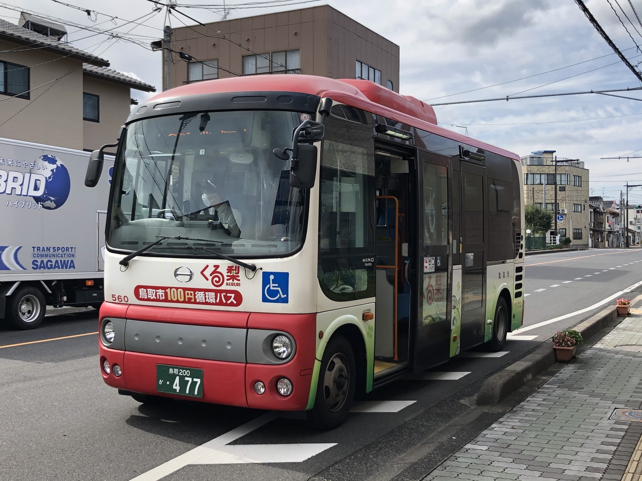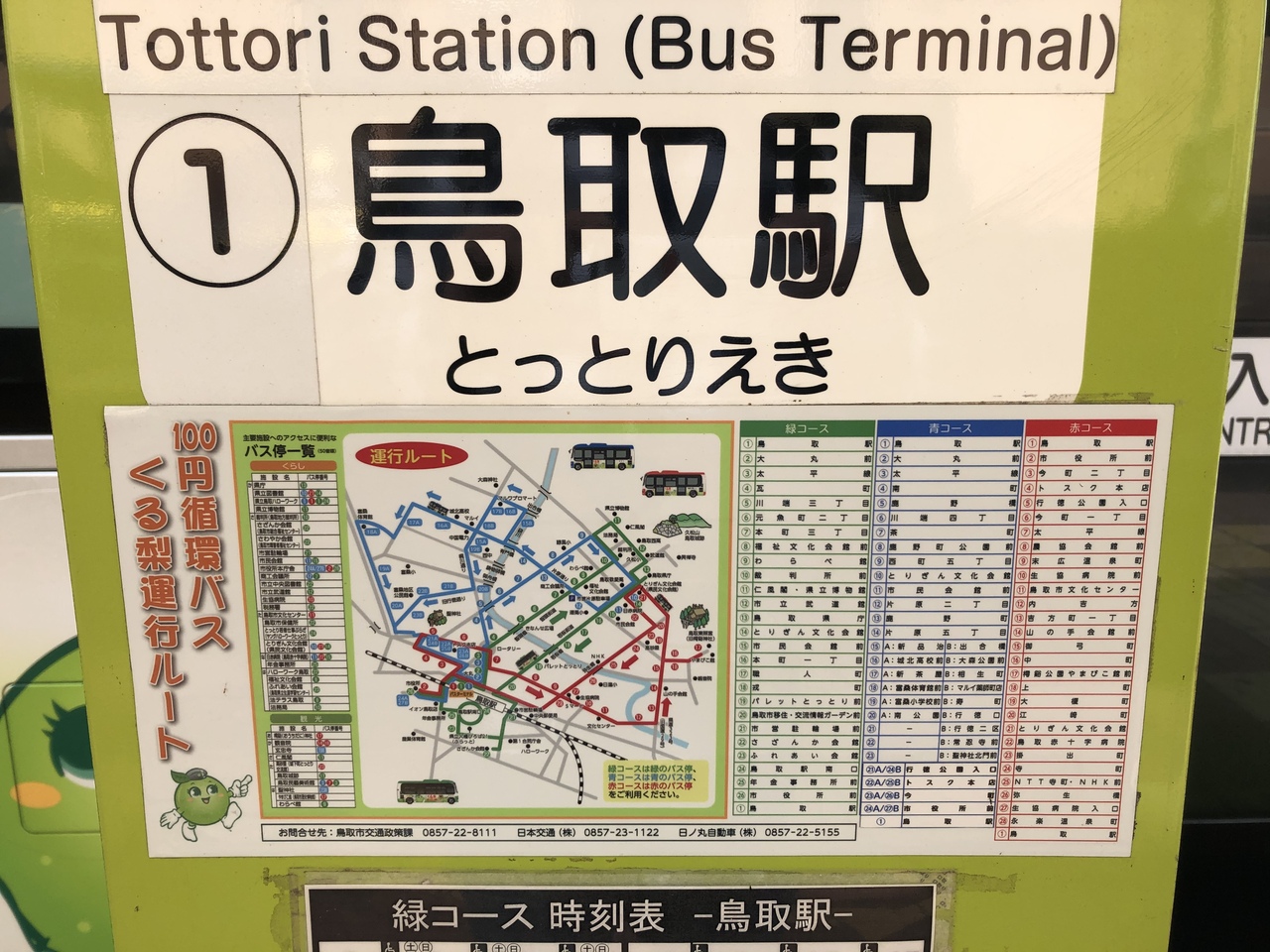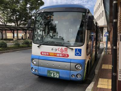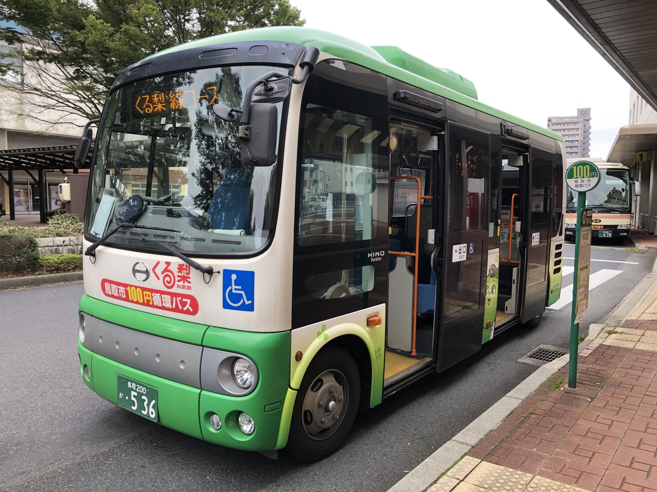 鳥取市が補助を行って運行する循環バス。全国各地で走るいわゆるコミュニティバスの一つで、鳥取の名産である「梨」と「くるくる回る」から「くる梨(くるり)」と名付けられています。どこでおりても乗っても100円で、緑コース、青コース、赤コースの3路線あり、緑、青、赤どのコースのバスも鳥取駅の0番乗り場が起終点。観光というよりは、市内の主要施設をこまめに巡るバスですが、ちょっとした移動などで結構使えます。しかも、朝8時から18時過ぎの最終バスまで20分起きに運行しており利便性が高い。緑と赤が日本交通、青が日の丸バスが担当しており、現金に加え、WAON、Edy、iD、QUICPayの利用が可能(通常の日の丸バス、日本交通共に、電子マネーはほとんど使用できない)。また、200円で3コース乗り放題の専用乗車券もある。