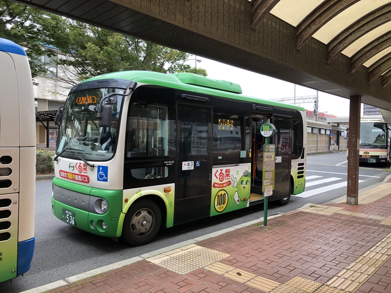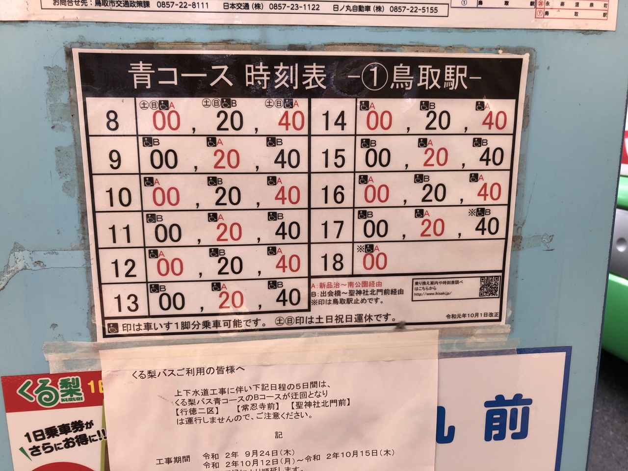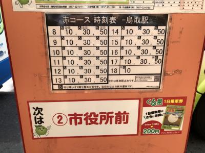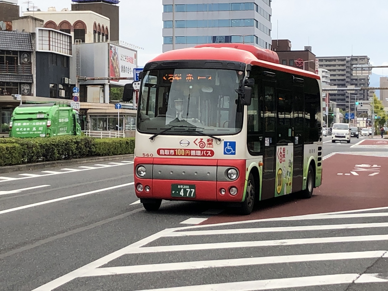 鳥取市が補助を行って運行する循環バス。全国各地で走るいわゆるコミュニティバスの一つで、鳥取の名産である「梨」と「くるくる回る」から「くる梨(くるり)」と名付けられています。どこでおりても乗っても100円で、緑コース、青コース、赤コースの3路線あり、緑、青、赤どのコースのバスも鳥取駅の0番乗り場が起終点。観光というよりは、市内の主要施設をこまめに巡るバスですが、ちょっとした移動などで結構使えます。しかも、朝8時から18時過ぎの最終バスまで20分起きに運行しており利便性が高い。緑と赤が日本交通、青が日の丸バスが担当しており、現金に加え、WAON、Edy、iD、QUICPayの利用が可能(通常の日の丸バス、日本交通共に、電子マネーはほとんど使用できない)。また、200円で3コース乗り放題の専用乗車券もある。