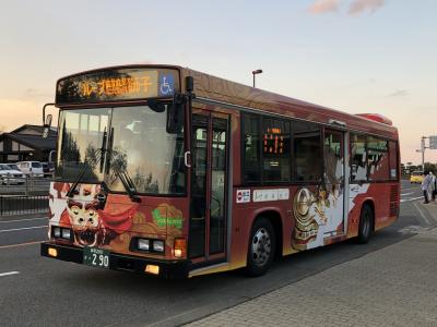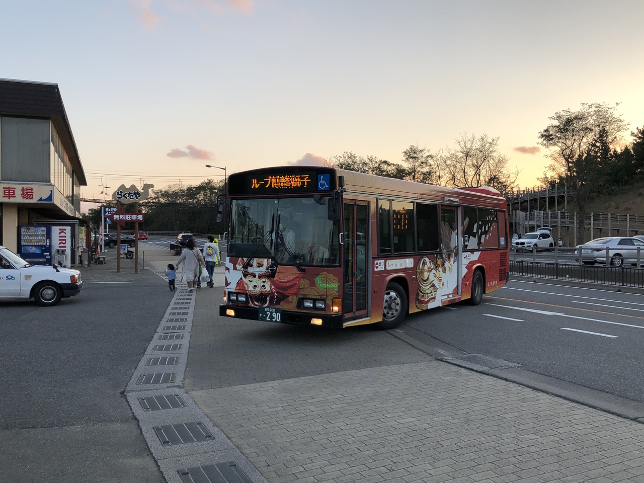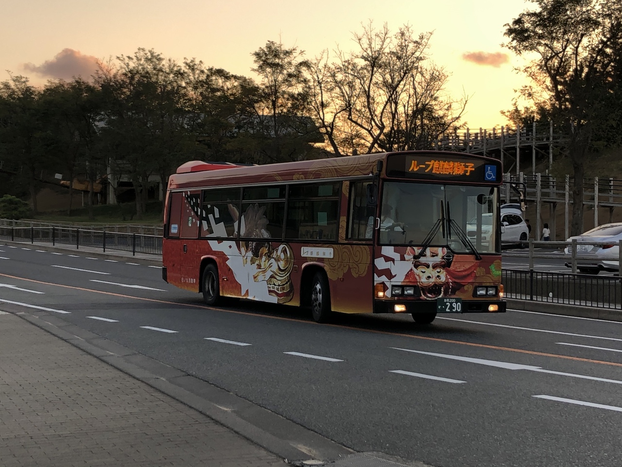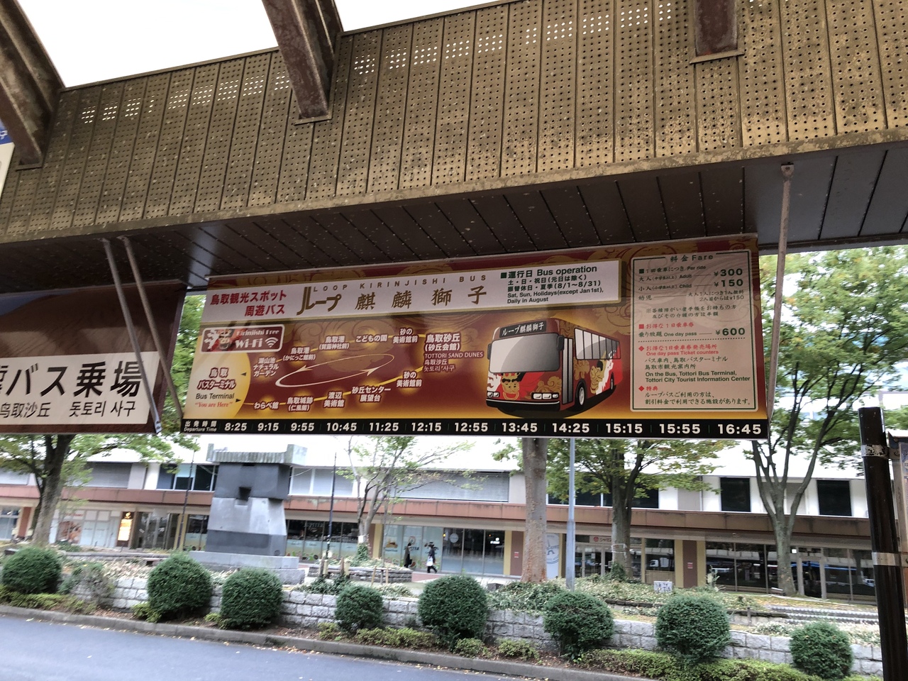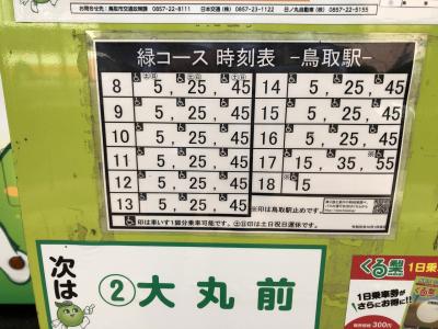 鳥取駅0番のりばをを起点に、鳥取砂丘、鳥取城跡、鳥取港(賀露港)、ナチュラルガーデンなど鳥取市内10箇所の観光名所を巡る周遊バス。土日と元旦を除く祝日、夏季(8/1~31)のみ運行されており、1日12本運行。以前は左回り、右回りの2ルートが運行されていましたが、現在は左ルートのみ。運賃は1回につき300円ですが、1日乗車券が600円で車内でも販売されており、2回以上乗るならこちらがお得。鳥取砂丘へも路線バスは片道380円かかるので、こちらの方が安い(ただし、鳥取駅に戻る場合は、かなり時間がかかる)。以前は観光地の周遊バスでよく見かける特別仕様の特装車が使われていましたが、麒麟獅子のラッピングされたバスが使用されています。