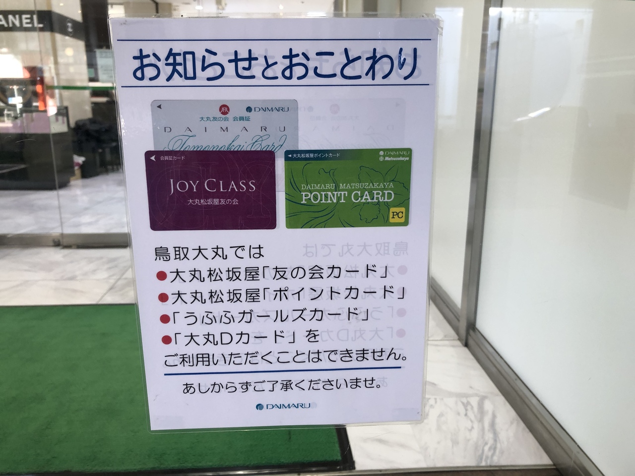 鳥取駅前にある地上5階、地下1階の百貨店。創業は、昭和12年(1937年)に老舗呉服店経営者由谷正太郎が元日ノ丸グループの創業者米原章三らとともに設立した山陰初の百貨店である「丸由百貨店」で、昭和24年(1949年)に大丸と資本・業務提携により「鳥取大丸」となりました。しかし、2000年頃から駅前の商店街の衰退とともに売上が低迷。2019年6月から大丸の資本関係がなくなりました。このため、鳥取大丸独自のカードを展開しており、大丸Dカードや松坂屋Mカードなど大丸松坂屋直営店舗のカードは使用できず、大丸や松坂屋発行のポイント付与率も、大丸松坂屋系以外の店舗と同じ。しかし、大丸との業務提携は続いているため、店舗のイメージは、大丸の直営店舗風で、包み紙なども大丸。ただ4階に無印良品が入るなど他の大丸松坂屋系では見られない特徴も。また5階とR階は、「TOTTORI PLAY'S」というスペースで、カフェやレストラン、鳥取市のスペースの他、鳥取が誇る日本遺産「麒麟獅子かのフォトスポットやチャレンジスペースになっており、買い物でなくても楽しめます。地下1階のデパ地下「ほっぺタウン」には、「TORINOMOTO百貨」というお土産店があり、駅や空港では販売していない山陰のお土産も揃えており便利。地場百貨店として頑張ってほしい。
