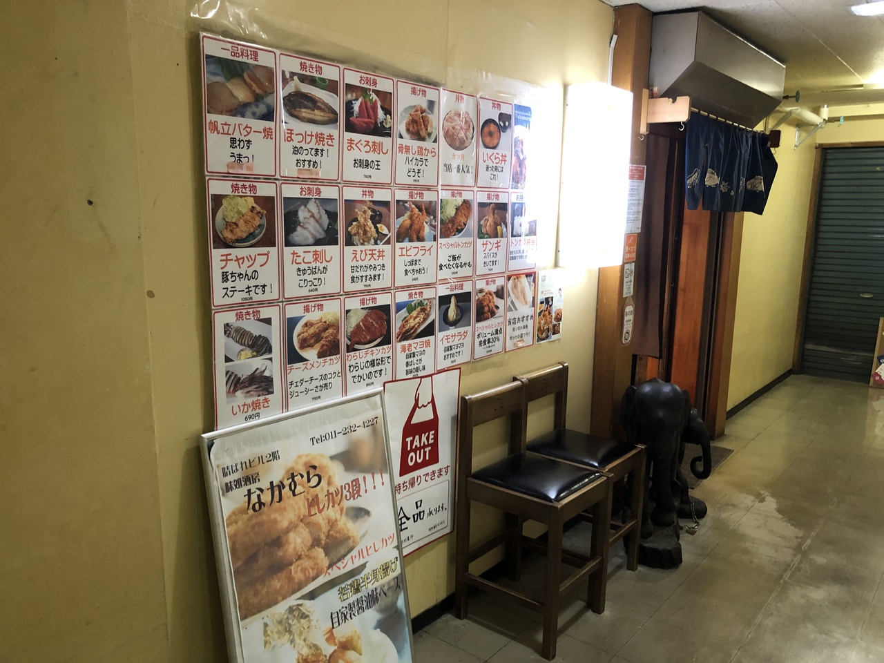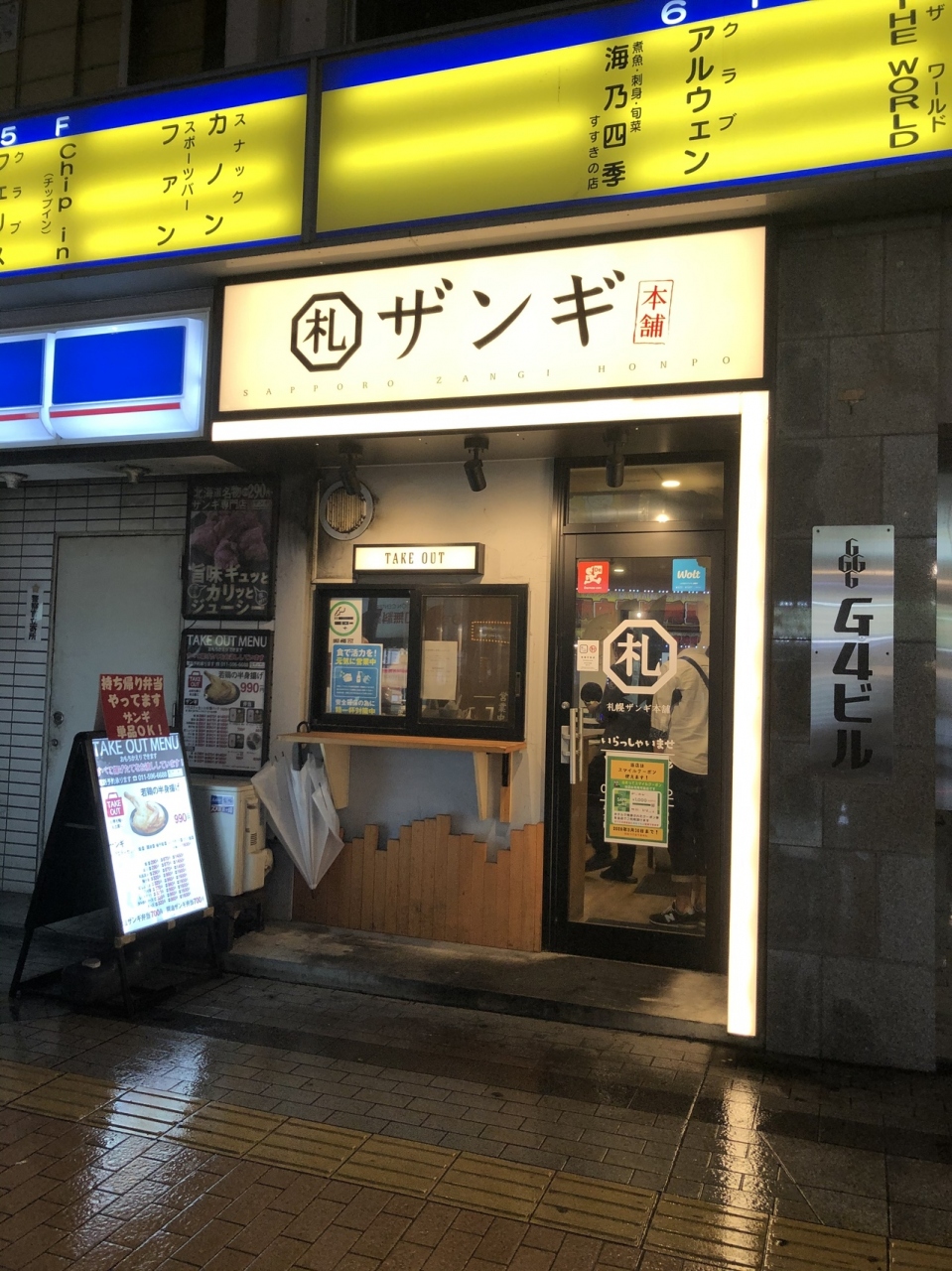 すすきの駅前通りのG4ビル(ラーメン山岡家の入るビル)にあるザンギメインのお店、正面玄関の左側にあり、通りすぎてしまうこともある。テーブル席が3つ、カウンター席6席の小さなお店です。ザンギの大きさは大きく、ボリュームがあり、揚げたてのサクサク感とジューシーさが味わえます。定職がメインですが、単品のザンギも2個から注文可能で、ドリンクメニューも豊富。あるこーるは200~300円で軽く飲むにもよい。ザンギ定食は大きめのザンギが4つ、小鉢は10種から2つ選択でき、キャベツとご飯はお代わり自由なので、コスパはかなり良い。ただ残念なのが、店員さんが少なく、配達までやっているようで、飲み物のお代わりでも結構な時間がかかること、喫煙可能なので、ノンスモーカーには辛い。