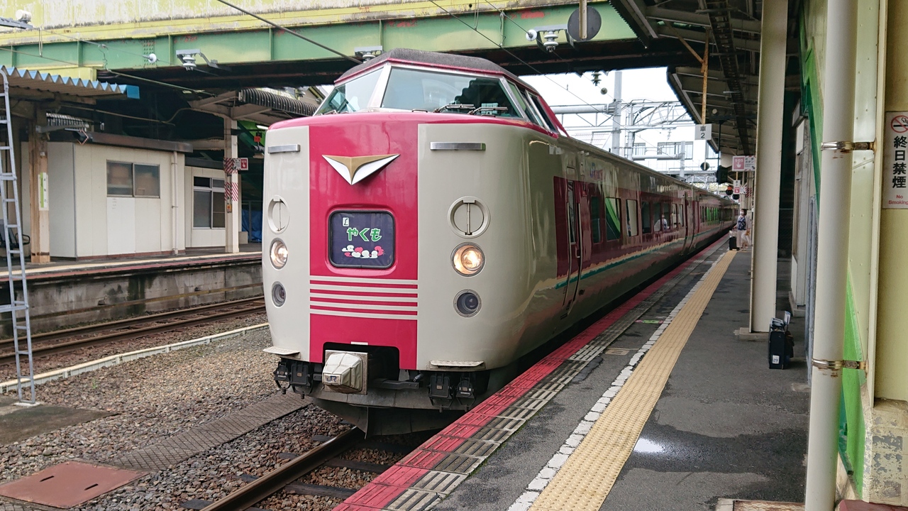 岡山~出雲市間、220.7kmを約3時間で結ぶ陰陽連絡特急。1972年3月に山陽新幹線岡山開業の際に新幹線の連絡特急として誕生した、東京方面から米子や松江に向かう場合の最短ルートを担う特急で、1日15往復運転されています。岡山~倉敷までは山陽本線、倉敷~米子の伯備線全線、米子~出雲市を山陰本線を走り、途中、倉敷、備中高梁、新見、米子、安来、松江はすべての特急が停車します。カーブの多い伯備線を走るため、1982年7月の電化時に導入された国鉄時代の振り子式の381系特急電車が使用されていますが、2006~2011年にかけて「ゆったりやくも」に大幅なリニューアルが行われており、座席はJR西日本の新型特急と同じものになり、シートピッチも拡大されているので快適。古さもあまり感じません。また、2、3、12、13、16、17、26、27はパノラマ型グリーン車が連結されていて、運転手気分が味わえます。振り子特急は、酔いやすいとあった印象があるのですが、色々改良されたのか、座っている限りにおいてはさほど感じませんでした。とはいえ製造から40年近く経っており、地元紙などによれば2022年には置き換えが始まるとのこと。新型車両の投入が待ち遠しいです。