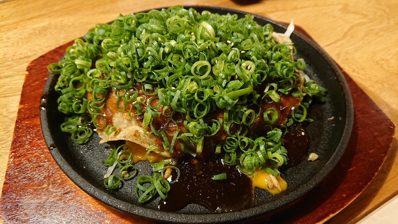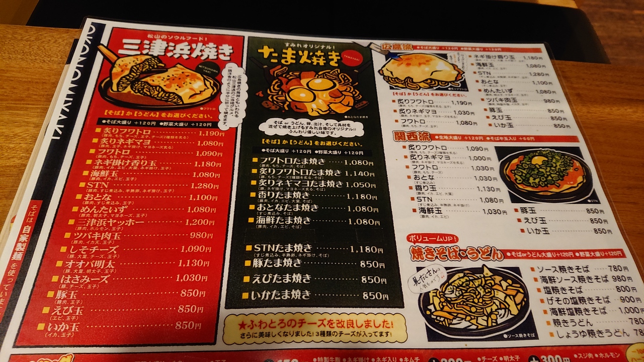 大街道と三番町交差点、三越の裏ににあるお店。三津浜焼きはメニューご16もあり、迷ってしまったので、お店の方にオススメを聞いたところ「ネギ掛け香り玉」が人気とのことで、そちらを注文。広島のお好み焼きの発祥とも言われる松山三津浜のご当地グルメには、豚肉、イカ、海老、大葉、ネギ、玉子が入っていますが、大葉がアクセント。一銭洋食のように折ってあるのがなかなかよい。また、広島と同じくヘラを出してくれるので食べやすい。この他、スピードメニューのスジ煮込みは、お肉がトロトロで、これでもかというくらいお肉がゴロゴロ入っていてコスパが良い。