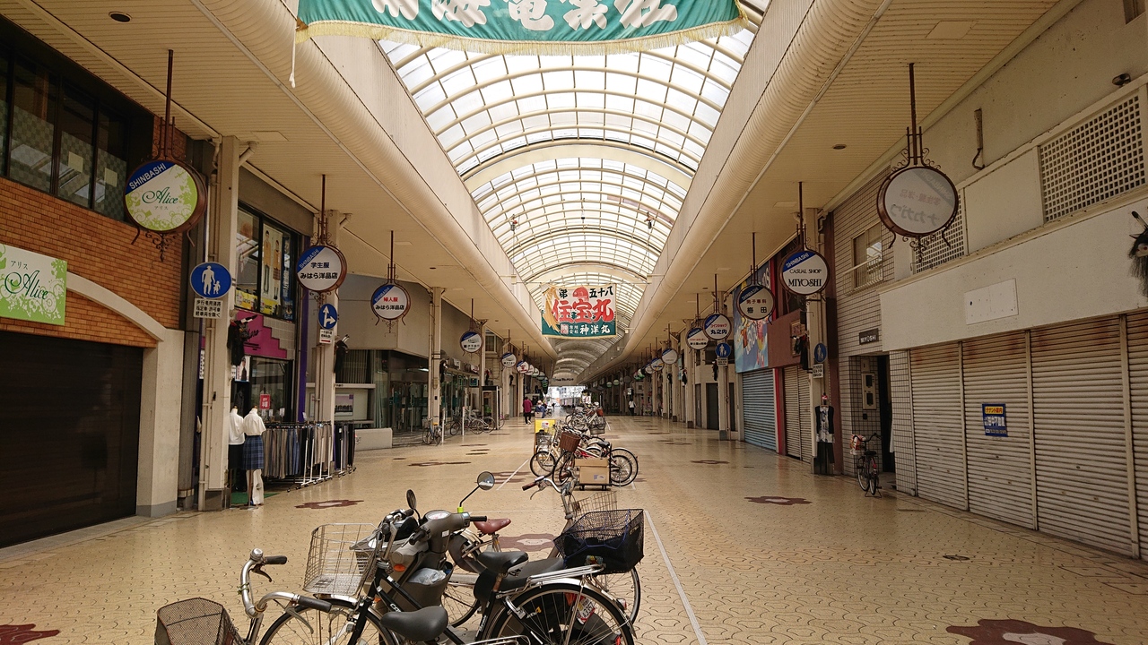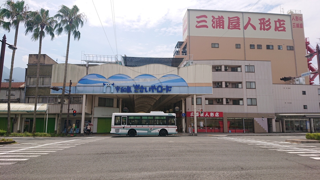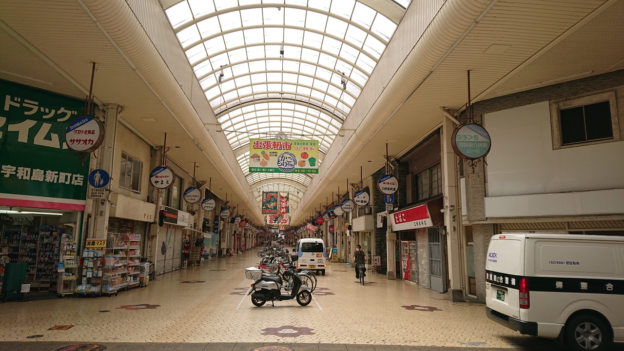 宇和島駅近くの商店街。宇和島を泳ぐ魚群や、牛鬼に闘牛、八ツ鹿踊りなど、宇和島の風物がちりばめられたカラフルな絵と大漁旗が天井を飾る大きなアーケードが印象的。宇和島の特産品や郷土料理のお店があるとのことで、少し歩いてみましたが、午前中だったせいか、人通りも少なく、シャッターが閉まったお店も多く、勢いを感じることはできませんでした。