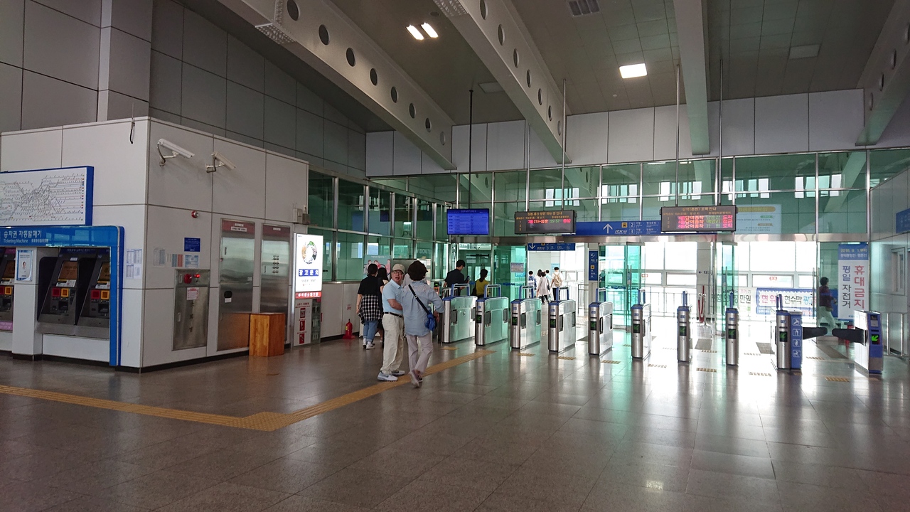 KORAIL京春線の終着駅。駅周辺は、駅構内のダンキンドーナツと駅横の観光案内所くらいしかない。こ!ほ、駐在韓米軍基地「キャンプ10ペイジ」があったため。繁華街と駅とをを分断していましたが、基地が閉鎖されたことにより、今後開発されるとのことです。駅としては、一つ手前の南春川駅の方が大きな駅に見えます。春川はソウルから日帰りのできる観光地であり、冬ソナのロケ地でもあることから、休日は観光客も多く、切符の券売機は混雑。しかし、切符の券売機は、韓国で発行したクレジットカードか現金しか使えず、駅の案内の方に問い合わせたら、駅の奥の事務所に連れていかれて、日本のクレジットカードも使うことができました。