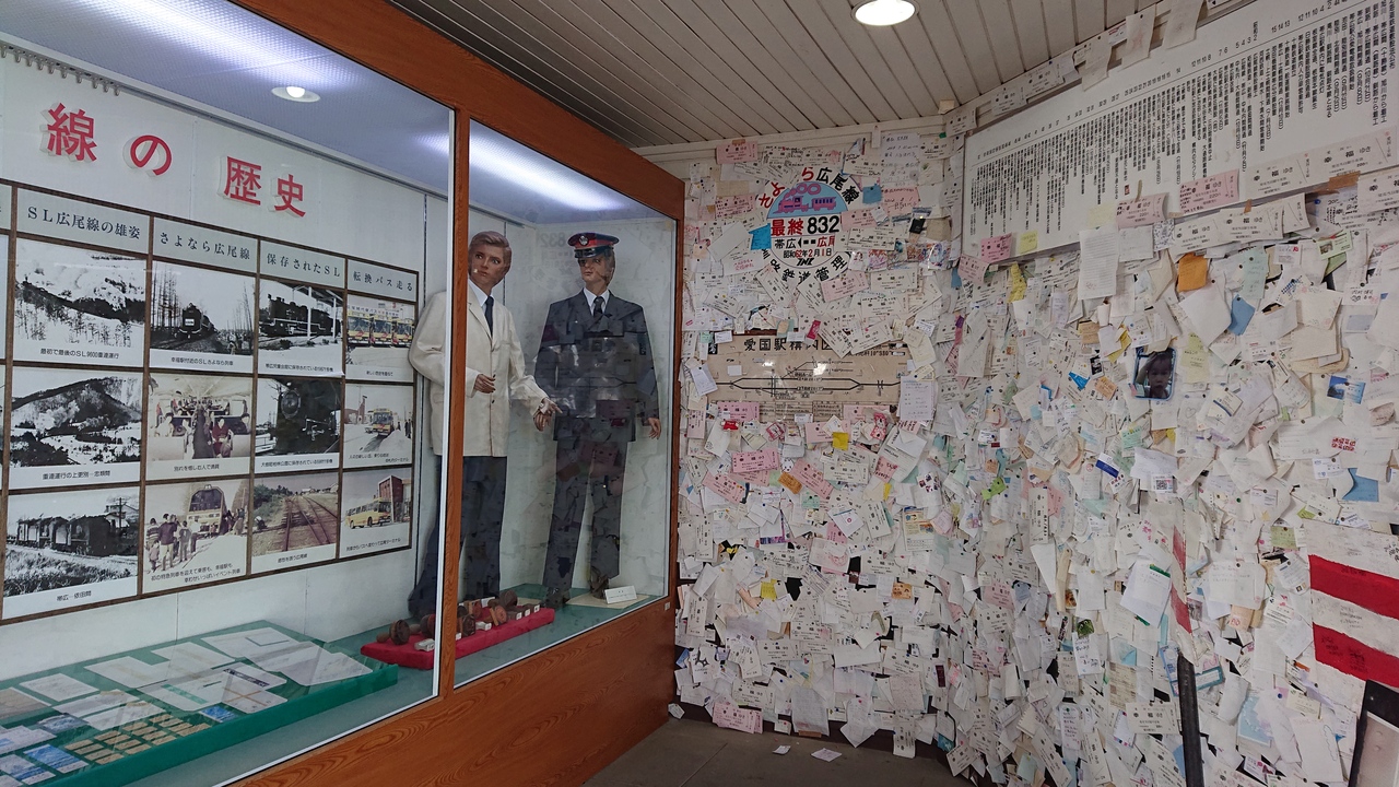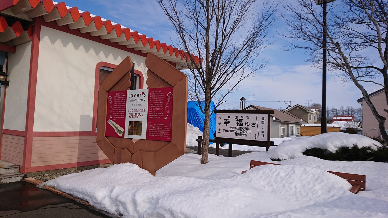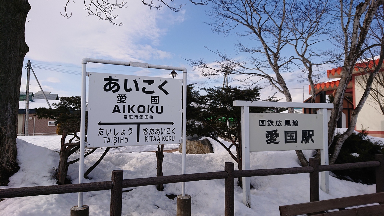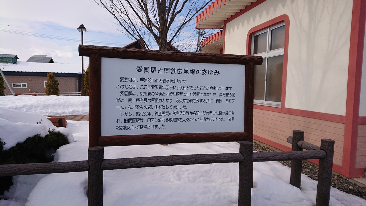 1987年2月に廃止になった旧国鉄広尾線の駅。帯広市内から車で20分くらい、旧広尾線の代替バス利用の場合、帯広駅から30分。とかち帯広空港に行く途中にあり、幸福駅の訪問とセットにすることも可能。駅舎は改築されており、交通記念館として利用されている。旧国鉄時代に使用されていた閉塞器や通標、切符、写真パネルなどが展示されており、見学は無料。また、プラットホームには、9600形蒸気機関車19671号機が保存、展示されていますが、冬季は錆を防止するためブルーシートで覆われている。愛国駅~幸福駅への切符のモニュメントや恋人の聖地登録記念碑などがあり、観光スポットとなっています。