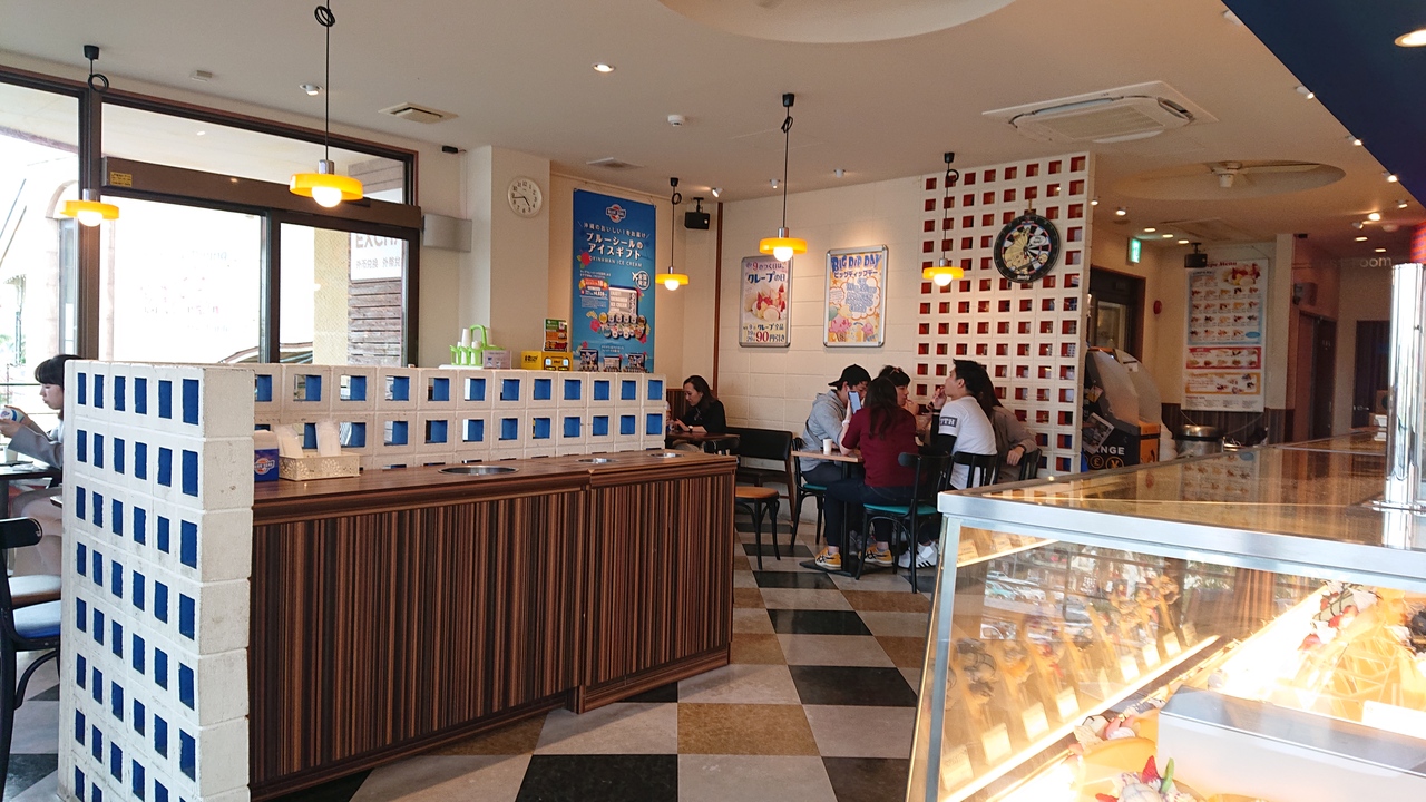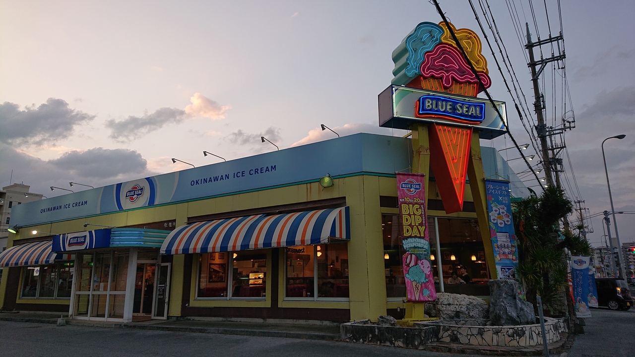 国道58号線(名護方向)、北谷町美浜のアメリカンビレッジの入口近くにあるブルーシール。牧港本店に次いでオープンした2号店で、アイスのほかにバーガー類やホットドッグなども楽しめる。白黒のブロックチェックの床、赤いソファなど、ブルーシールアイスクリームのアメリカンテイストがいっぱいのお店は、本土ではなかなか味わえない雰囲気。直営店なので、もちろん10日と20日は、Big Dip Dayを開催。シングル価格で3つのフレーバーを楽しめます。目の前は米軍基地なので、米軍関係者も思われるお客さんも多いのも、このお店の特徴かも。沖縄に行ったら必ず通ってしまうお店の一つです。