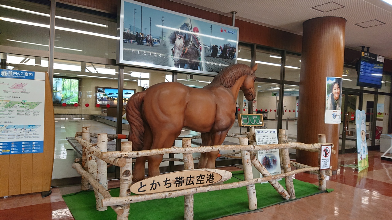 帯広市内から25キロ、帯広駅前まで連絡バスや車でおよそ40分くらいのところにある空港。1981年に現在地に移転し、ジェット化された。季節運航を除くと東京便のみで、JALが4便、ANAとコードシェアのエアドゥーが3便の7便。季節運航の中部便はありますが、大阪便はありません(ちなみに、帯広市内からPeachの大阪便にあわせて釧路空港行きのバスが出ています)。長らく東亜国内航空(TDA)→日本エアシステム(JAS)のみが発着する地方空港でしたが、1994年にJAL名古屋線、1995年に福島線、1996年に仙台線が開設、さらに1997年にJALが参入しダブルトラック化。その後、JALによるJAS統合を経て、2011年3月にエアドゥーが参入し、再びダブルトラック化されました。黒い屋根と茶色の壁面のターミナルビルは黒川紀章氏の設計によるもので、十勝平野を意識した外観。売店や飲食店は出発ロビーのある2階にまとめられており効率的。六花亭もありサクサクも販売。1階ロビーには国内唯一のばんえい競馬のPRとしてばんばのオブジェがあります。