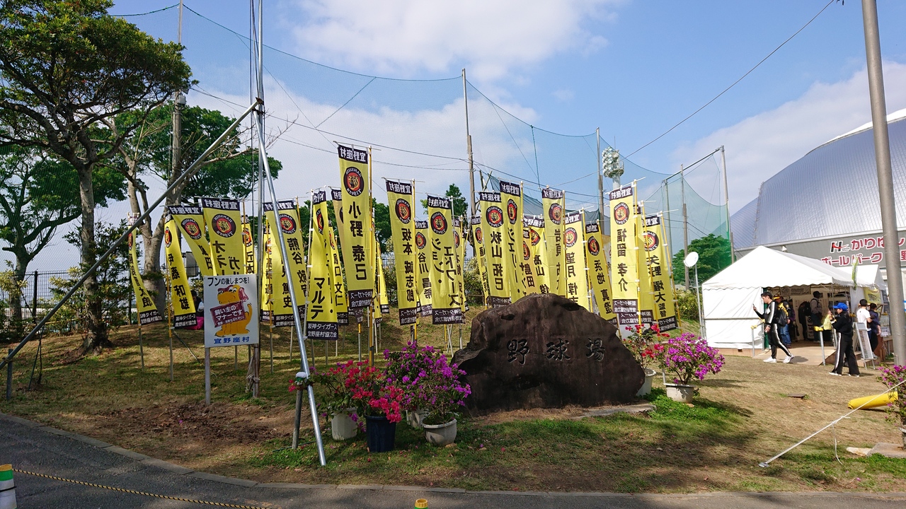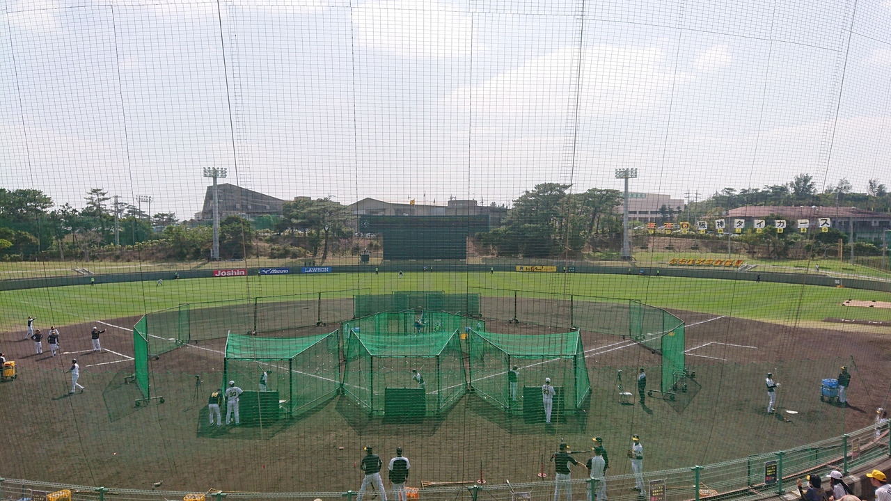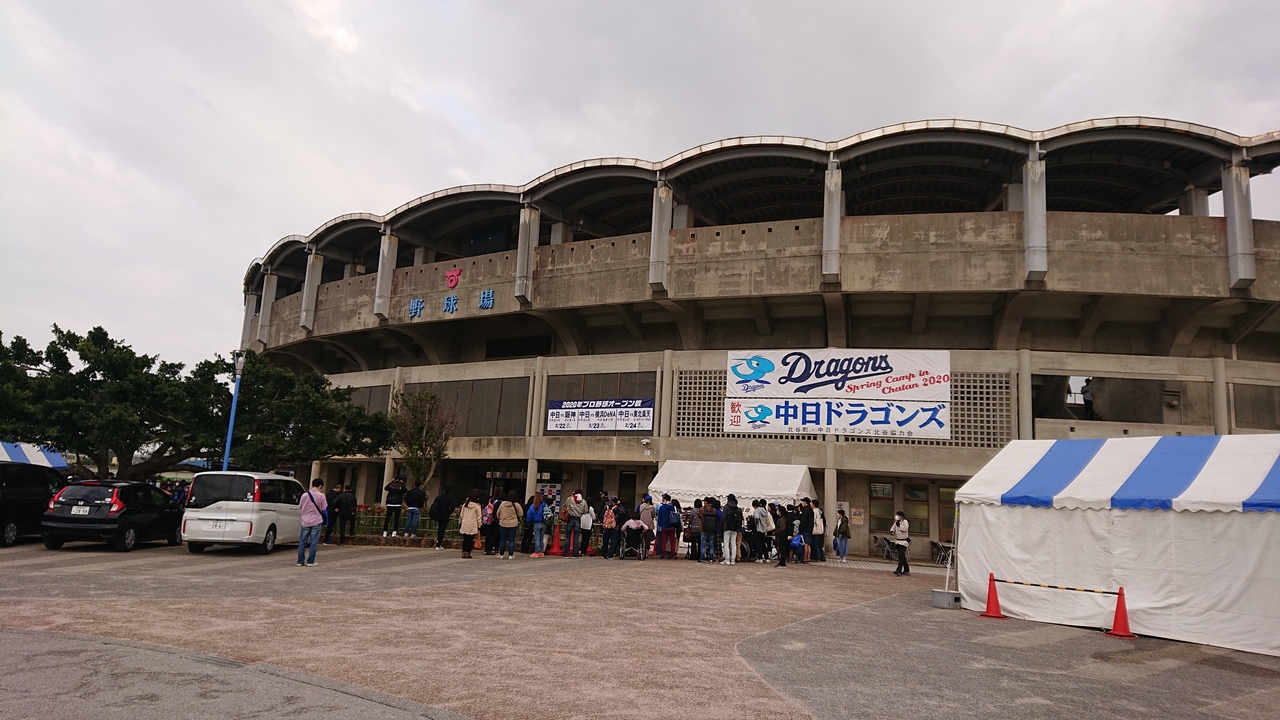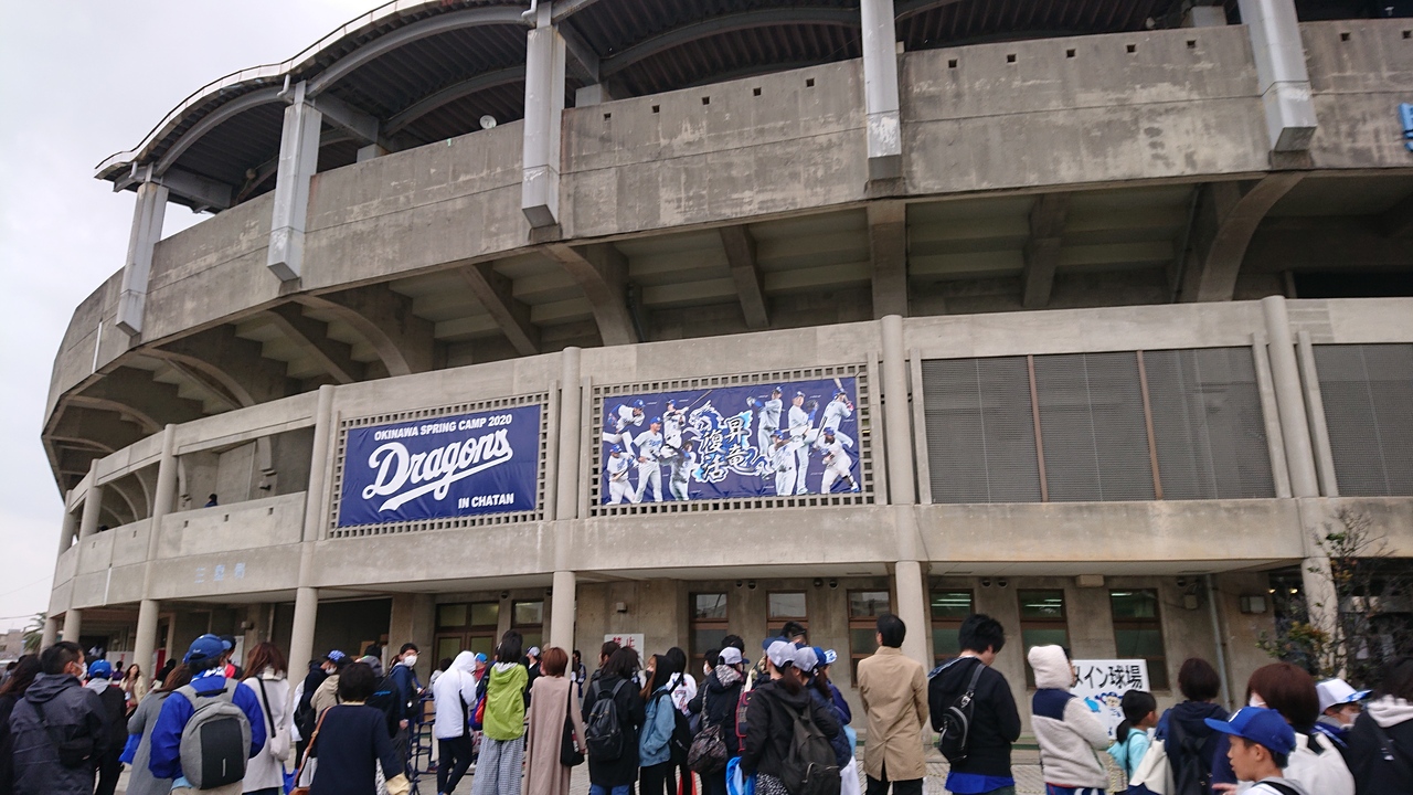 1995年に開場した北谷にある野球場。夏の高校野球沖縄県大会の決勝戦や中日ドラゴンズの1軍春季キャンプが行われ、2月のオープン戦でも毎年2試合開催されており、マスコミでもたびたび登場するスポット。スタンドから練習の様子を見学することができ、もちろん無料。球団の配慮で代表選手がサインに応じていただけることもあります。また、私が訪問した日は、与田監督がサインに応じてくださいました。練習終了後の球場の出入口から選手の出待ちは多数。キャンプ中は、中日どらの売店が出店し、グッズの購入はもちろん、人気マスコットのドアラに出会うことも。美浜のアメリカンビレッジのサンエーや観覧車、サンセットビーチなどに隣接しており、数ある沖縄のプロ野球キャンプ地のなかでも便利な場所にある。このため、駐車場は混雑することもあるので注意。