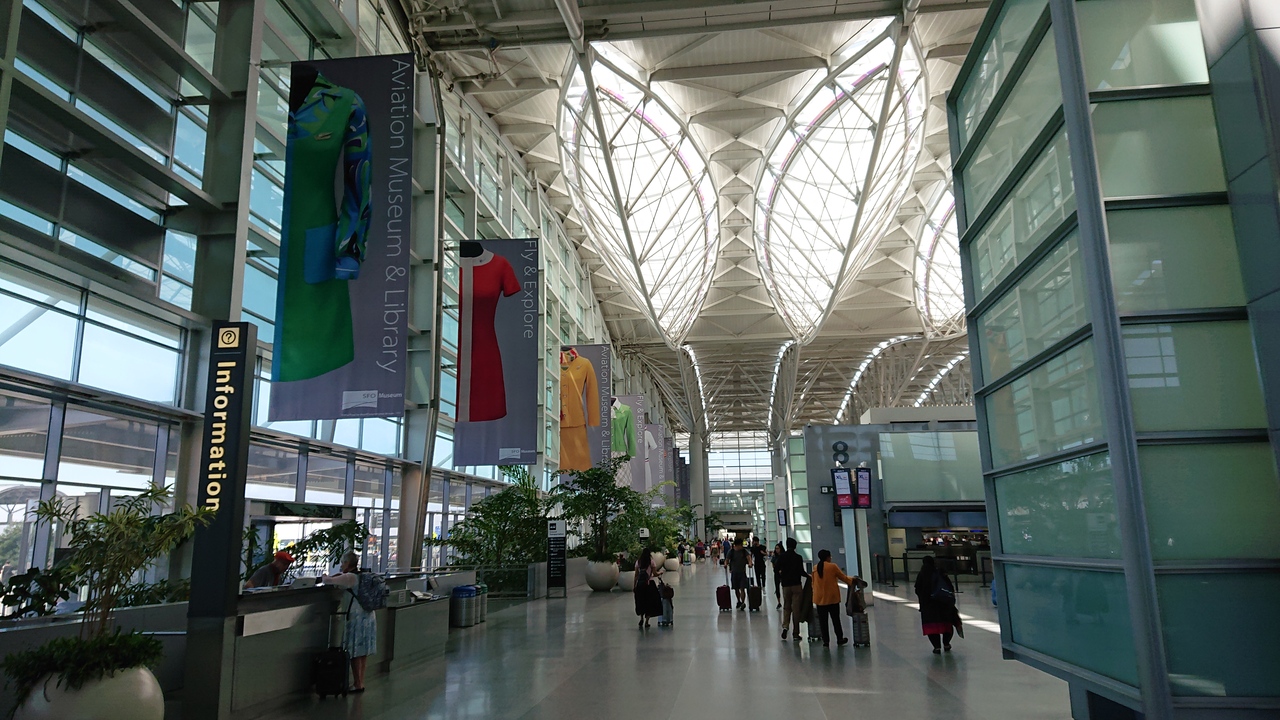 ロサンゼルスと並ぶ北米西海岸の玄関口の一つ。ダウンタウンから南に22キロのところにあり、国内線用のターミナルが3つと国際線ターミナルに分かれており、国内線のターミナル1と3、国際線ターミナルはボーディングブリッジエリアが2つあります。日本からのフライトの場合、JALはポーディングエリアA、ANAやUAはボーディングエリアGです。制限エリア内には、お土産店、レストランもそれなりにあり、名物のクラムチャウダーを売るお店もありますが、全体的には羽田や成田と比べると控えめ。レストランはエスニック中心ですが、お寿司やおにぎり、麺類なども食べられます。ダウンタウンへのアクセスは、タクシーで20~40分、50ドルくらい、シャトルバンで25ドルくらいですがラッシュ時はかなり渋滞するので、荷物が少なければBART(電車)がおすすめ。パウエル駅まで9.15ドル、ダウンタウンまで約30分くらいです。なお、サンフランシスコは霧が多い地域であるため、夏は濃霧による遅延することがたまにあります。