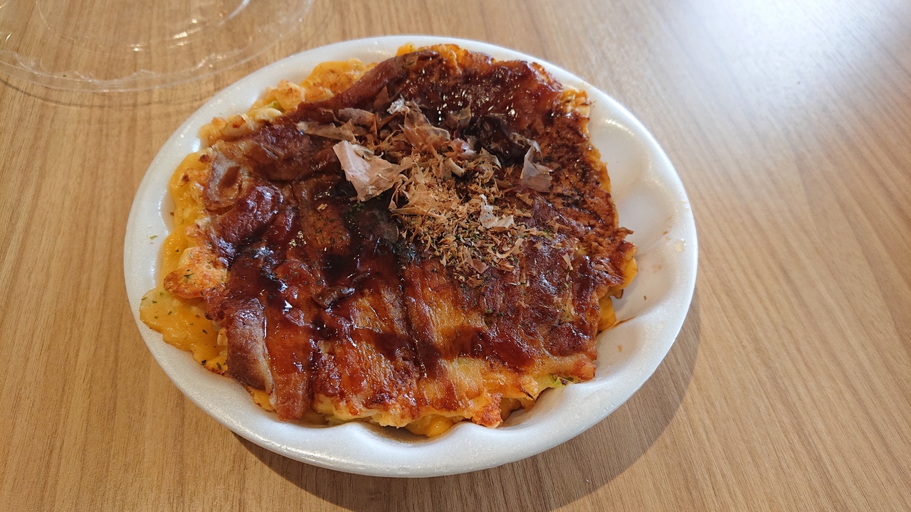 天満屋ハピータウン児島店TOPIAの1階のフードコートにあるお好み焼きのお店。天満屋の目の前にあるお店の分店のようですが、こちらはテイクアウトオンリー。昔ながらの親しまれるお店、という印象で、女性の店員さんが、お好み焼きだけでなく、焼きうどんや唐揚げ、天ぷらなど、種類が豊富。お好み焼きは焼いたものを売っており、なくなるとその先の需要を予測しながら焼いているようです。お好み焼きはワンコインで購入可能。ただし、ソースの量ほか個別のオーダーは不可。ボリュームがありましたが、個人的にはもう少しソースをかけて欲しかった。PayPayの乗車可能。